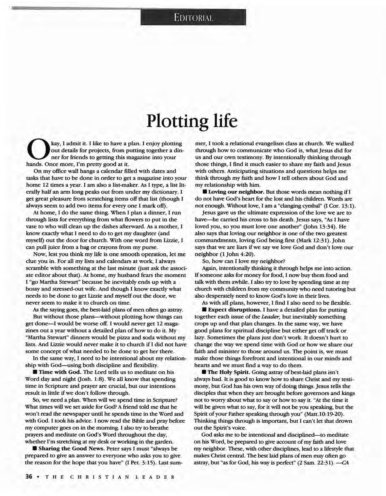 • Expect disruptions. I have a detailed plan for putting together each issue of the Leader, but inevitably something crops up and that plan changes. In the same way, we have good plans for spiritual discipline but either get off track or lazy. Sometimes the plans just don't work. It doesn't hurt to change the way we spend time with God or how we share our faith and minister to those around us. The point is, we must make those things forefront and intentional in our minds and hearts and we must find a way to do them