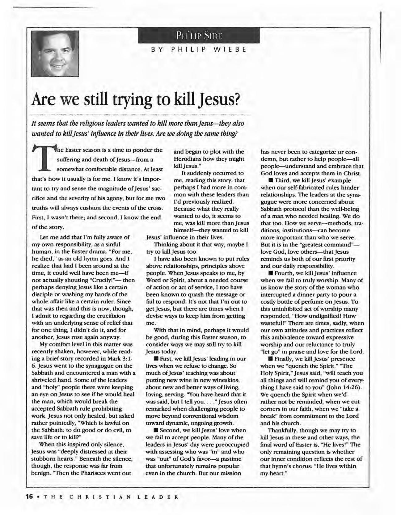 Based on "What they did not hear, " page 8, and Phil Wiebe's "Ph'lip Side" column, "Are we still trying to kill Jesus?" page 16.