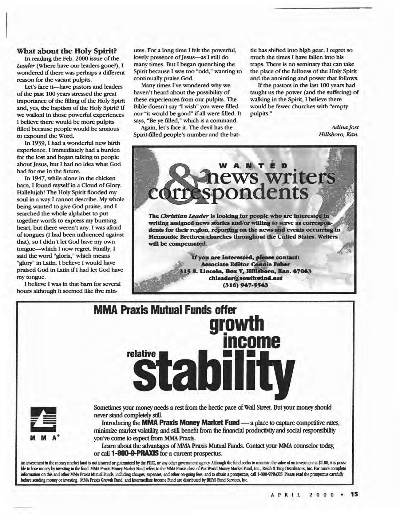 The Christian Leader is a member of the Evangelical Press Association and Meetinghouse, an association of Mennonite and Brethren in Christ editors.