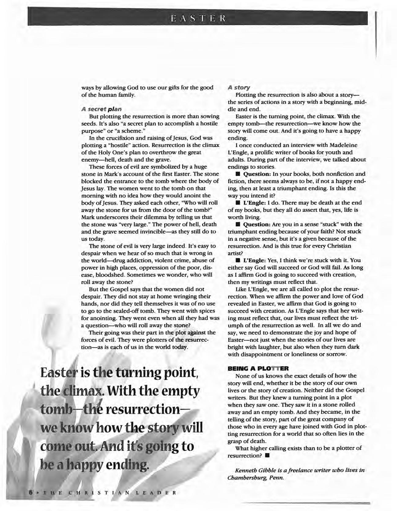 Like L'Engle, we are all called to plot the resurrection. When we affirm the power and love of God revealed in Easter, we affirm that God is going to succeed with creation. As L'Engle says that her writing must reflect that, our lives must reflect the triumph of the resurrection as well. In all we do and say, we need to demonstrate the joy and hope of Easter-not just when the stories of our lives are bright with laughter, but also when they tum dark with disappointment or loneliness or sorrow.