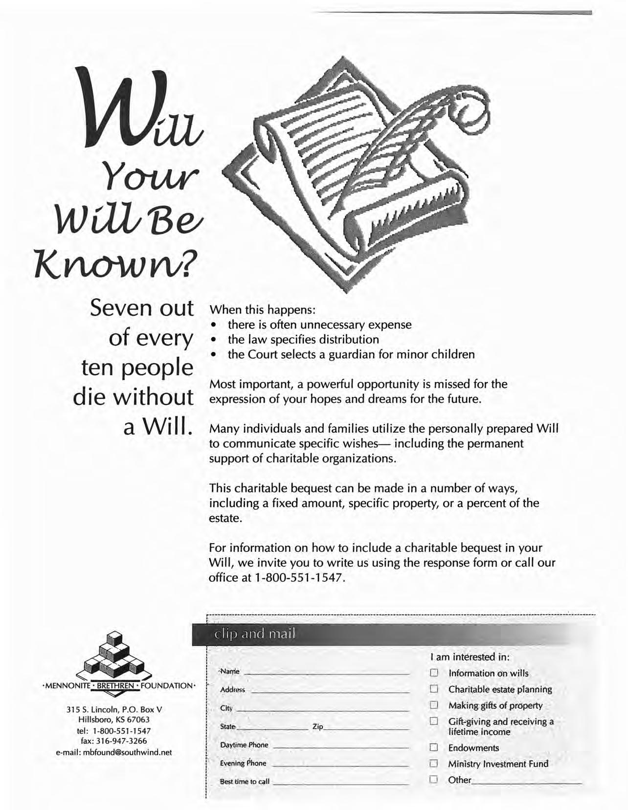 The editors invite free-lance article submissions, essays to Forum and letters to the editor. Forum is open to members or attendees of Mennonite Brethren churches. The essays can address any issue of relevance and interest to the faith and life of the Mennonite Brethren Church and should be no longer than 800 words and include the home church and occupation of the writer. A SASE must accompany articles and forum essays.