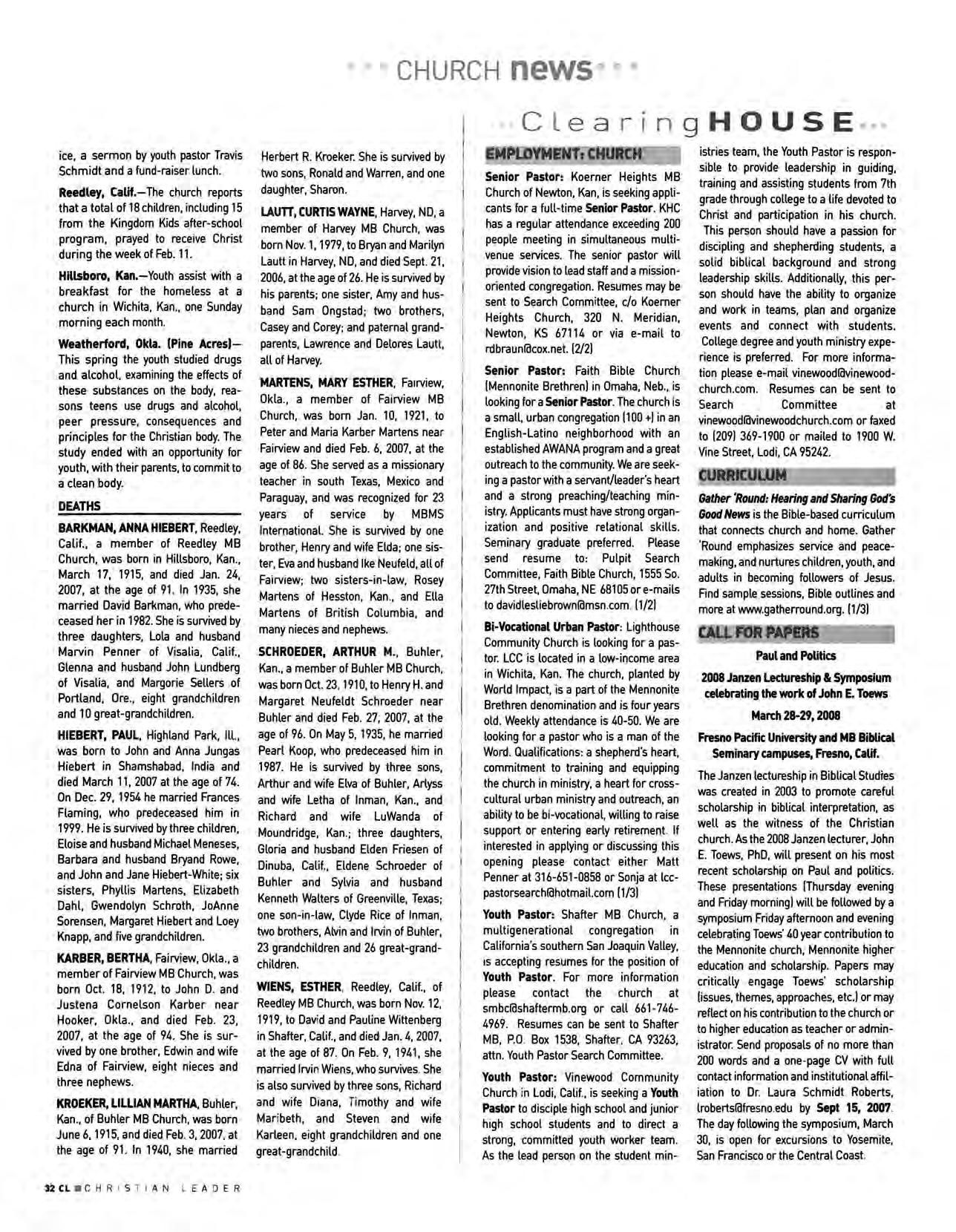 Senior Pastor: Faith Bible Church [Mennonite Brethrenl in Omaha, Neb., is looking for a Senior Pastor The church is a small, urban congregation [100 +1 in an English - Latino ne ighborhood with an established AWANA program and a great outreach to the community. We are seeking a pastor with a servant/leader's heart and a strong preaching/teaching ministry Applicants must have strong organization and positive relational skills. Seminary graduate preferred Please send resume to: Pulpit Search Committee, Faith Bible Church, 1555 So. 27th Street, Omaha, NE 68105 or e-mails to davidlesliebrown!amsn com [1/21
