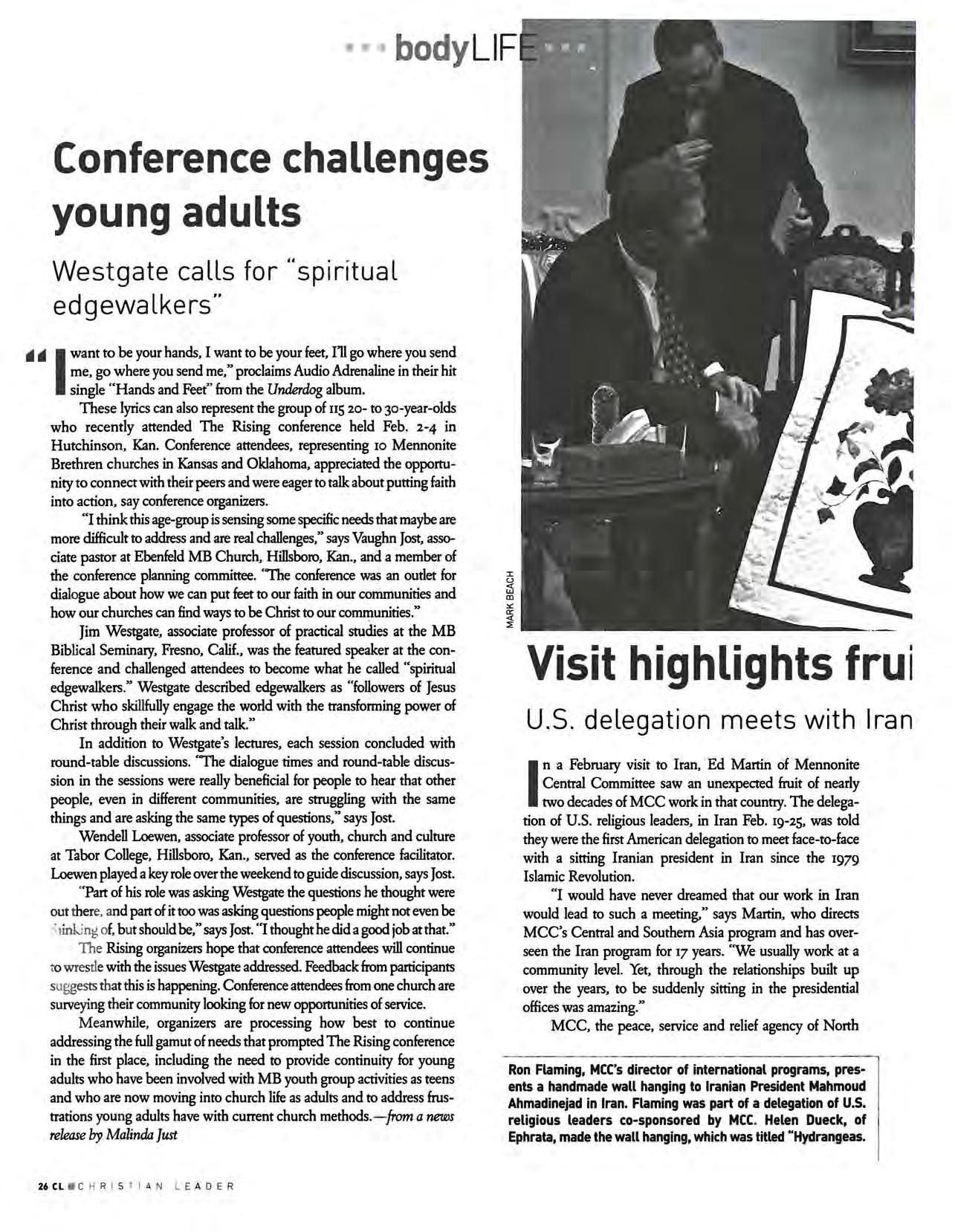 Four years ago, with the war in Iraq was just days old, 1,420 Mennonite Brethren from around the country clustered in quartets, praying audibly for the condition of the world, specifically the developing war in Iraq. The guided prayer time was part of the closing worship service at the 2003 national MB youth convention held March 22-25 at YMCA of the Rockies near Estes Park, Colo.