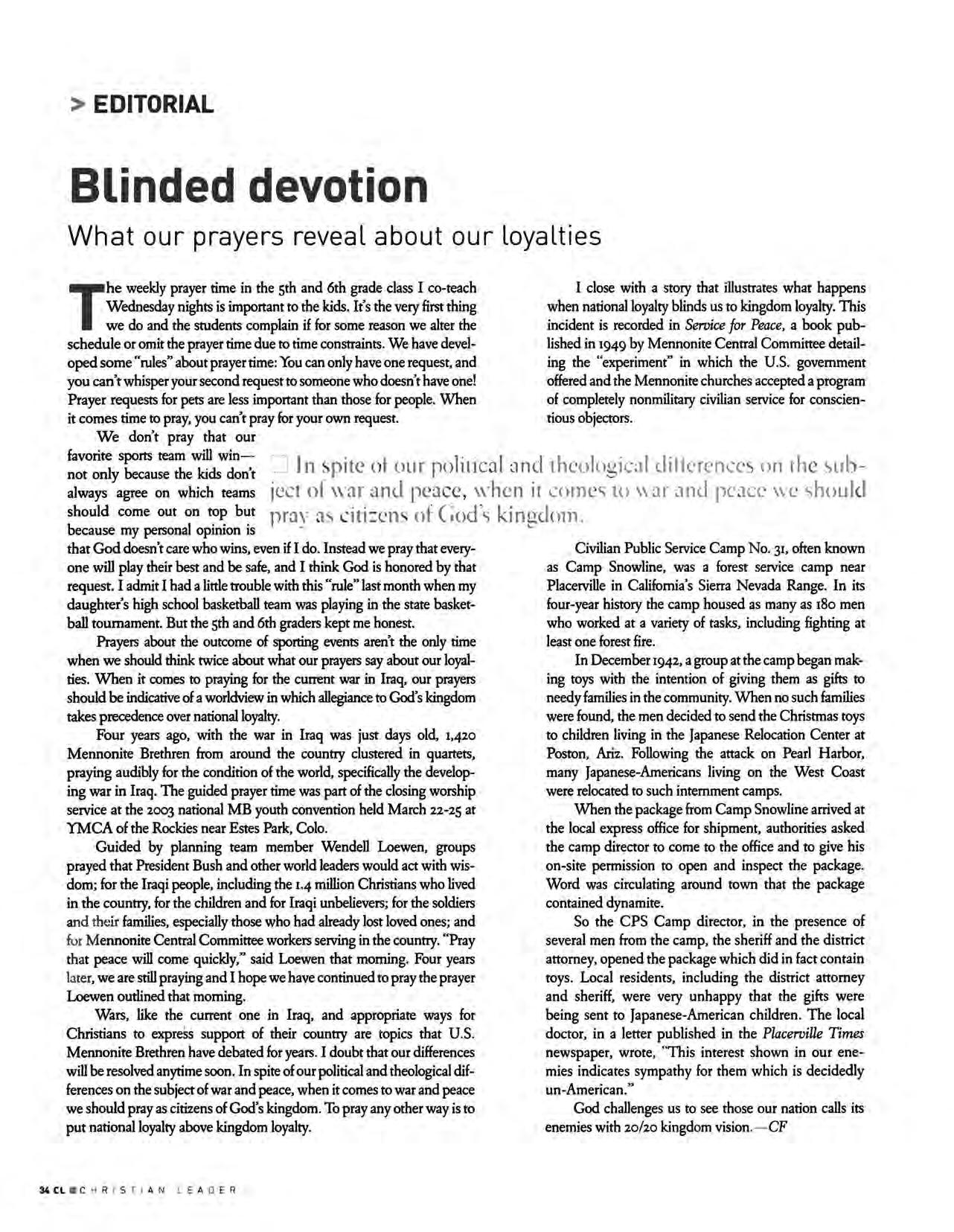I close with a story that illustrates what happens when national loyalty blinds us to kingdom loyalty. This incident is recorded in Service for Peace, a book published in 1949 by Mennonite Central Committee detailing the "experiment" in which the U.S. government offered and the Mennonite churches accepted a program of completely nonmilitary civilian service for conscientious objectors