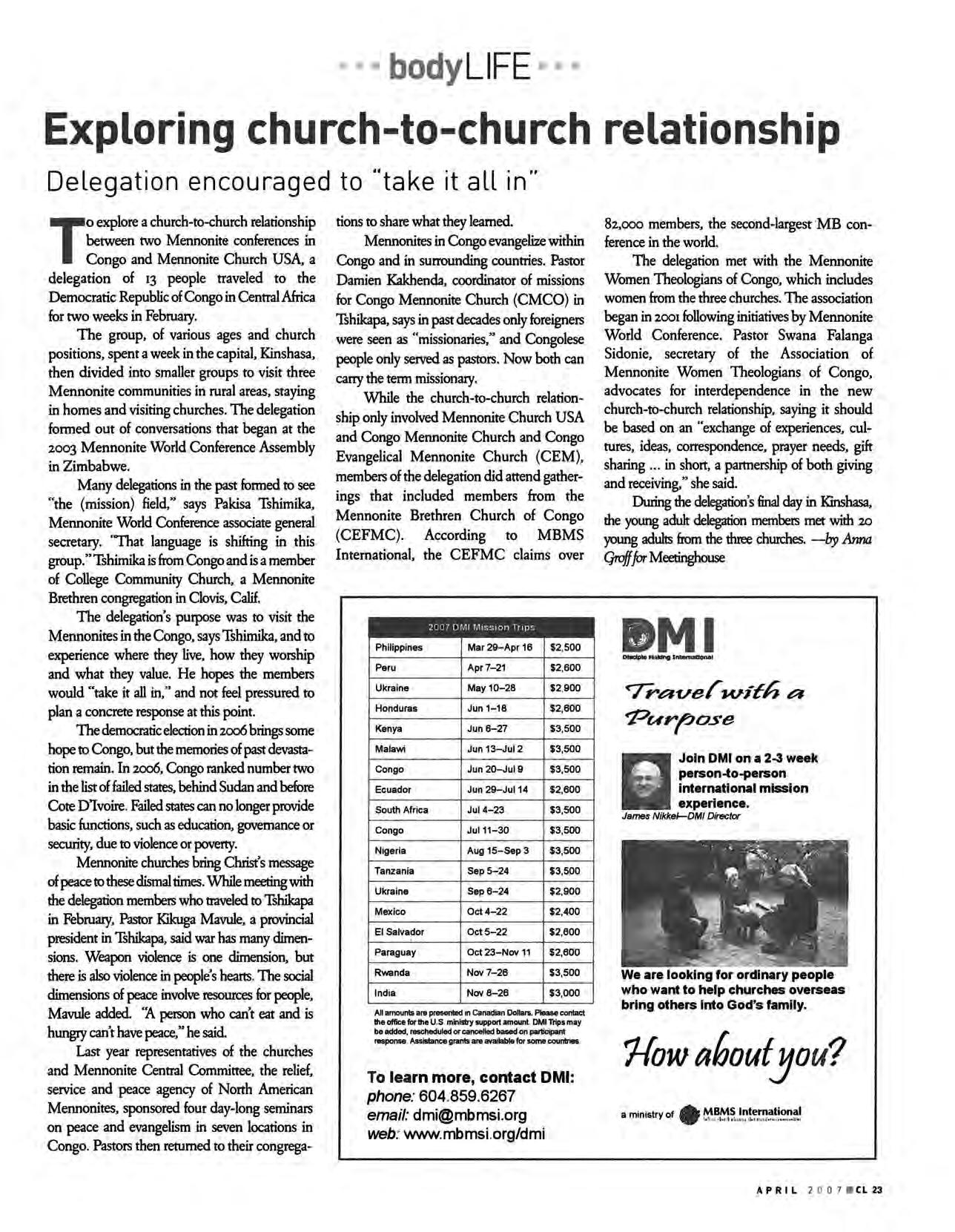 Dora Dueck, associate editor of the MB Herald, the publication for MBs in Canada, has announced her resignation, effective July 2007. Dueck has been an integral member of the Herald team since June 2003. She plans to resume working as a writer and editor on a freelance or contract basis. The Herald is searching for a new associate editor. The Herald welcomed Barrie McMaster as British Columbia regional correspondent in early February. In his newly created part-time position, McMaster will ensure that the province receives high quality, comprehensive ongoing editorial coverage. About half of all Canadian MBs live in B.C.-MB Herald