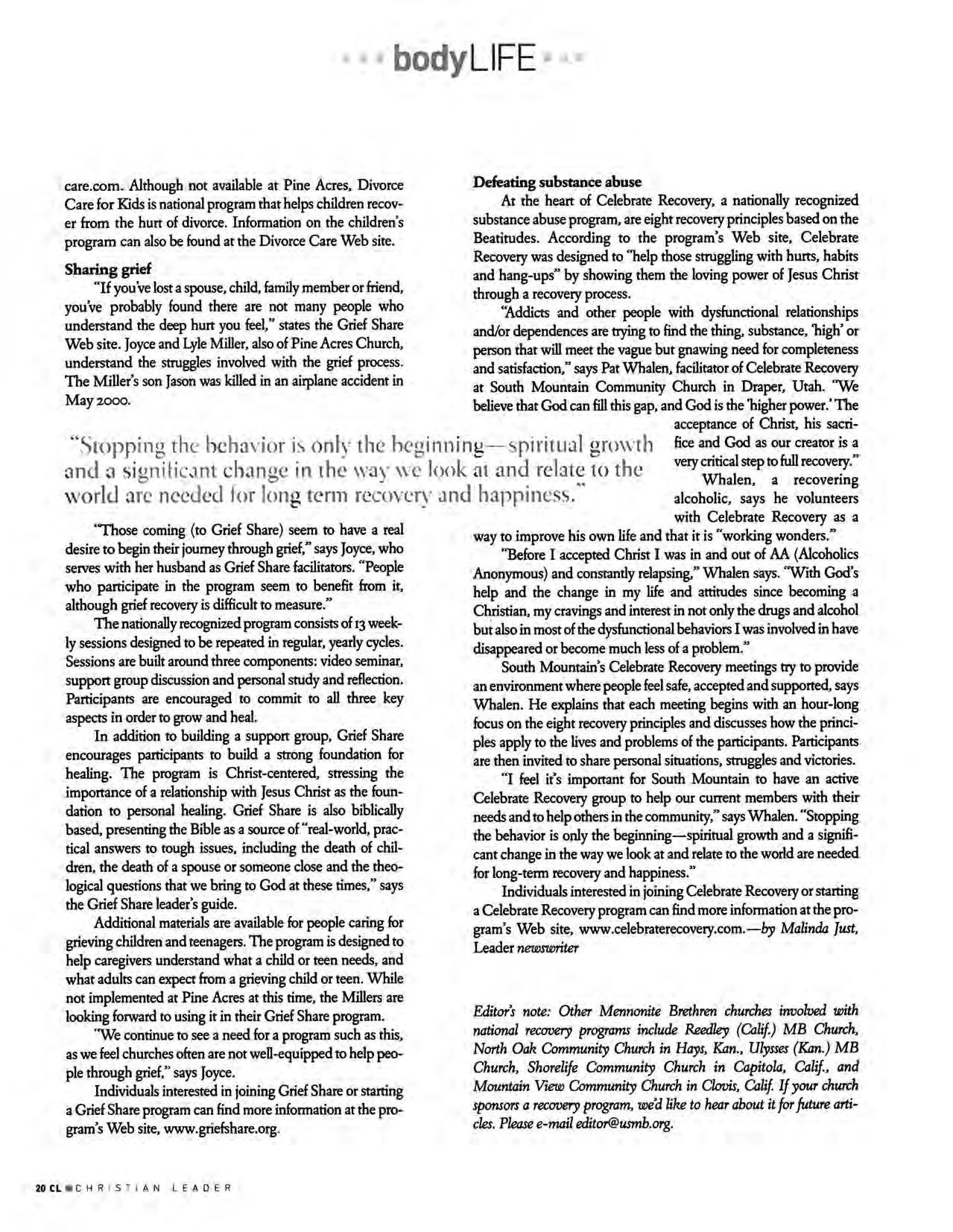 EDITORIAL POLICY The views expressed in thi s publication do not nece ss arily represent the position of the Christian Leader. the U S. Con fere nce Leadership Board or the Me nnoni t e Brethren Church Scripture references are from New International Ve rsi on unless otherwise not ed The edi tors invite freelance article submissions A SASE m ust accompany articles