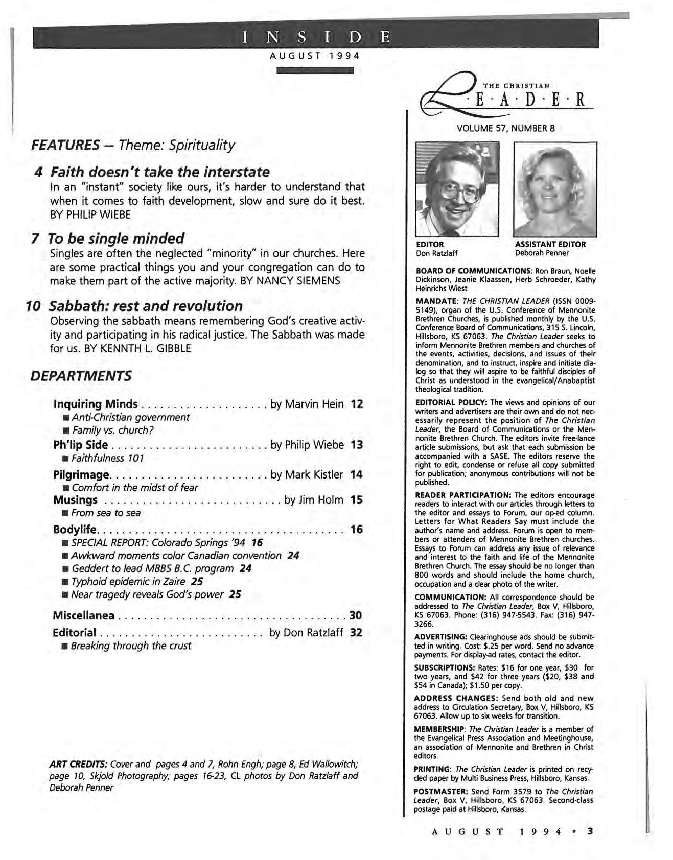 MANDATE: THE CHRISTIAN LEADER (ISSN 00095149), organ of the U.S Conference of Mennonite Brethren Churches. is published monthly by the U.S. Conference Board of Communications, 315 S Lincoln, Hillsboro, KS 67063 The Christian Leader seeks to infor m Mennonite Brethren members and churches of the events, activities, decisions, and issues of their denomination, and to instruct, inspire and initiate dialog so that they will aspire to be faithful disciples of Christ as understood in the evangelical!Anabaptist theological tradition.