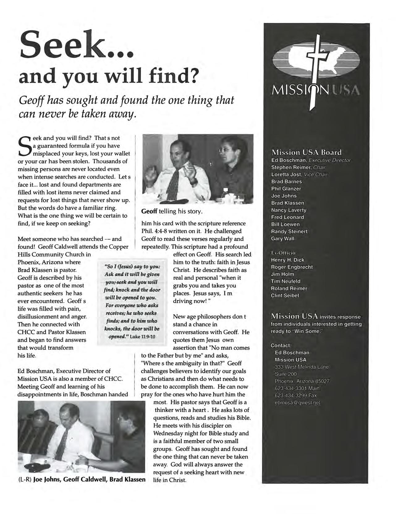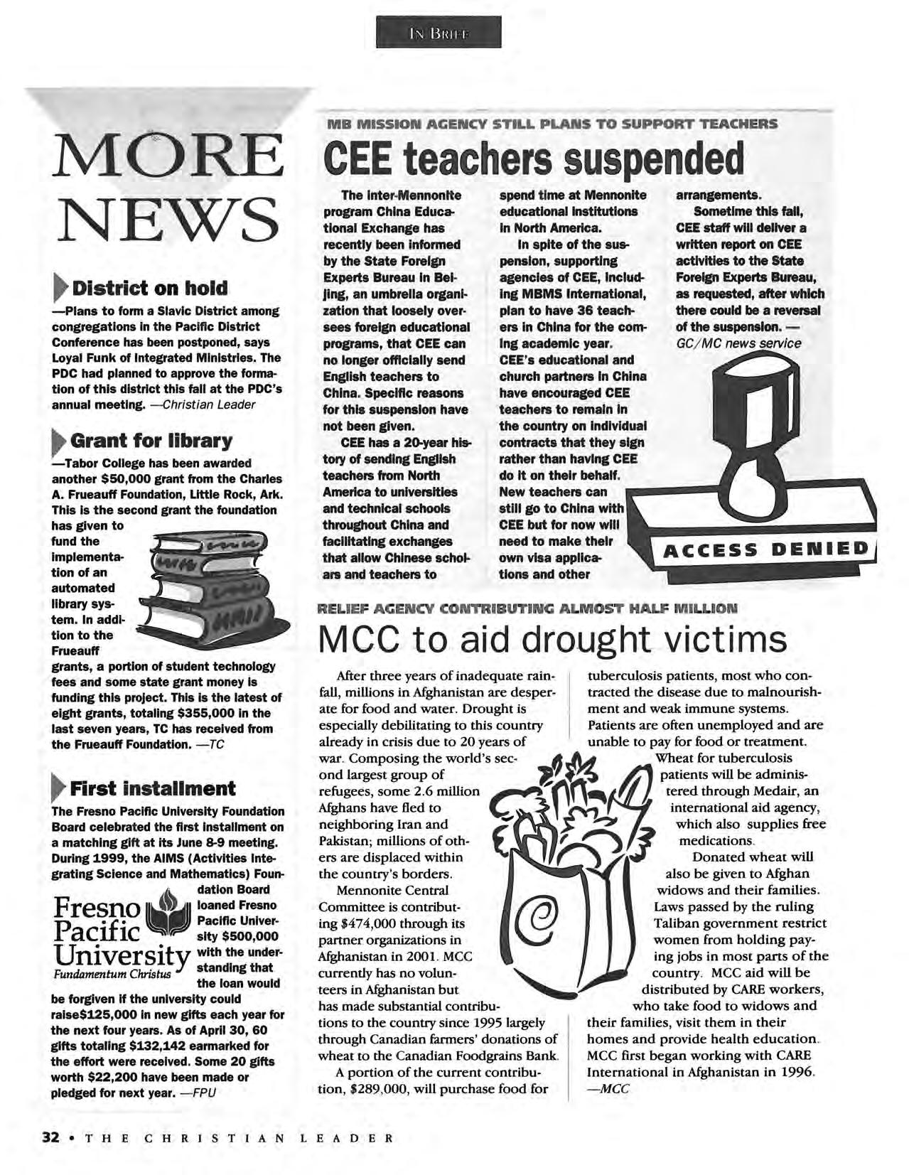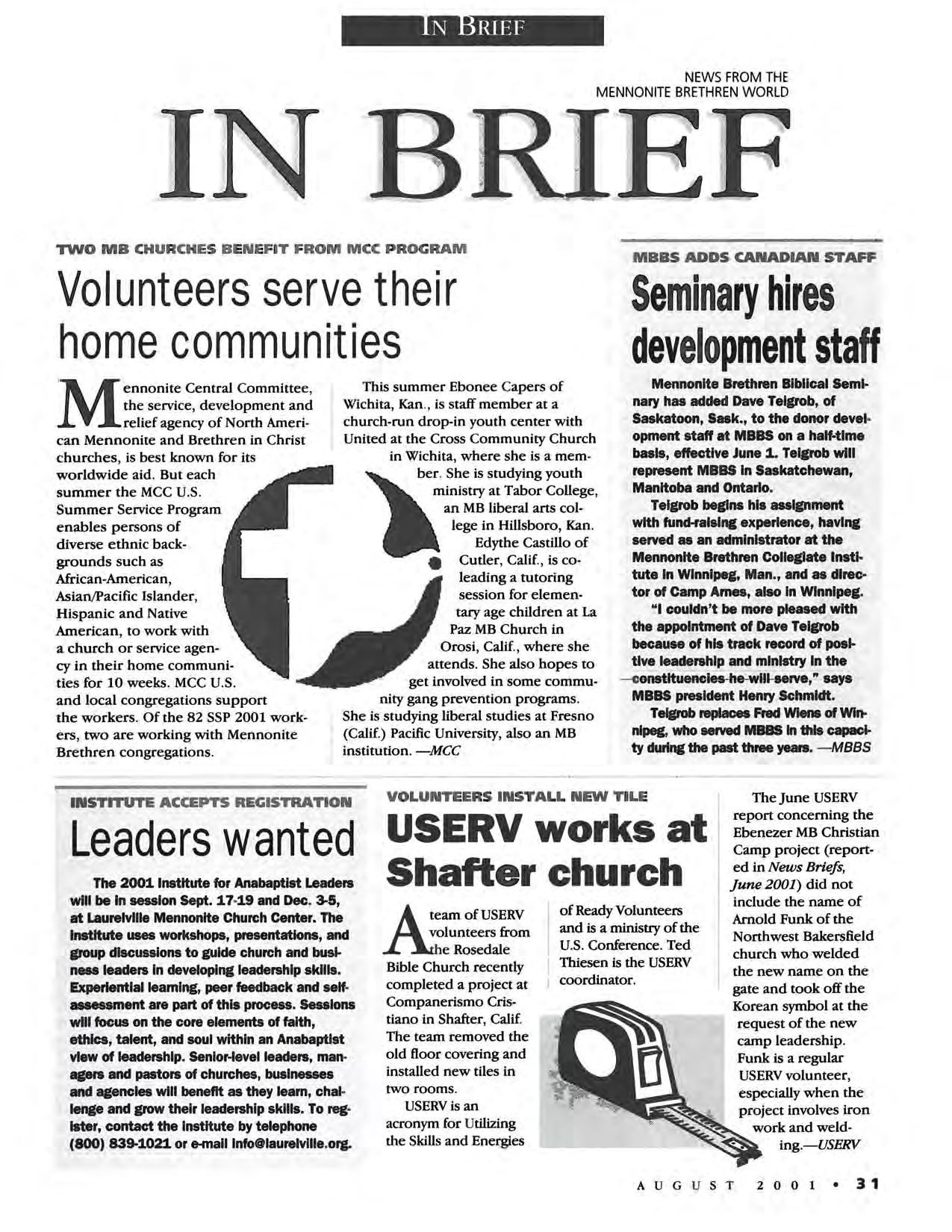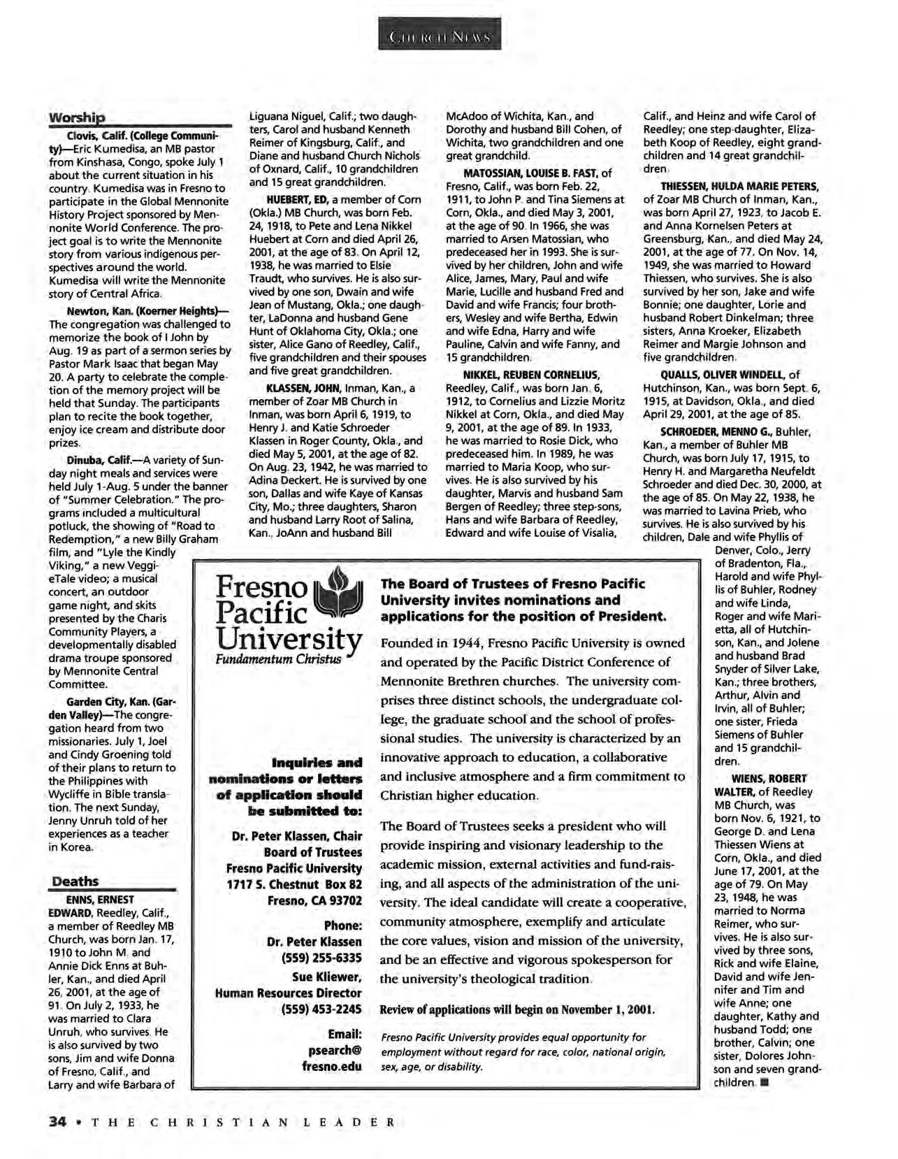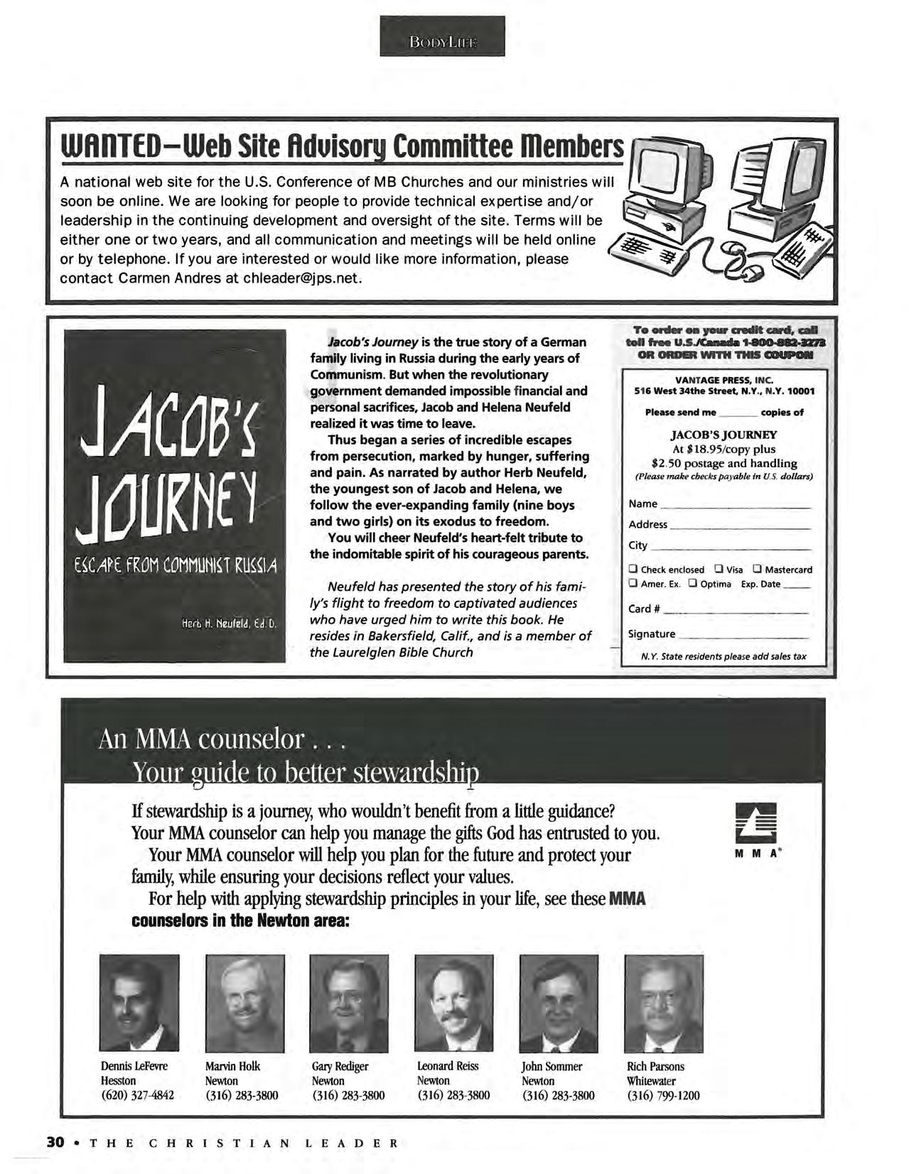 The Christian Leader (lSSN 0009 -5149) is published monthly by the U S Conference of Mennonite Brethren Churches, 315 S Lincoln, Hi llsboro, KS 67063. The Christian Leader seeks to inform Mennonite Brethren members and churches of the events, activities, decisions and issues of their denomination, and to instruct, inspire and initiate dialogue so members will aspire to be fa ithful disciples of Chr ist as understood in the evangelical/Anabaptist theological tradition However, the views expressed in this publication do not necessarily represent the position of the Christian Leader, the Board of Communications or the Mennonite Brethren Church