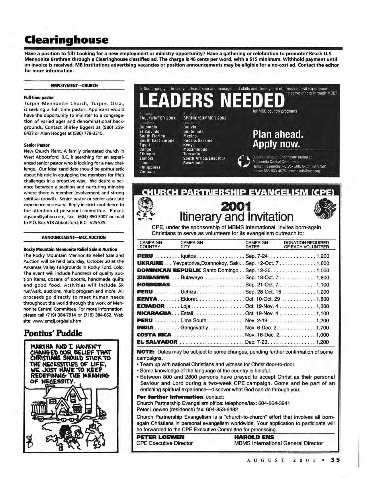 Turpin Mennonite Church. Turpin, Okla., is seeking a full time pastor. Applicant would have the opportunity to minister to a congregation of varied ages and denominational backgrounds. Contact Shirley Eggers at (580) 2596437 or Alan Hodges at (580) 778-3315