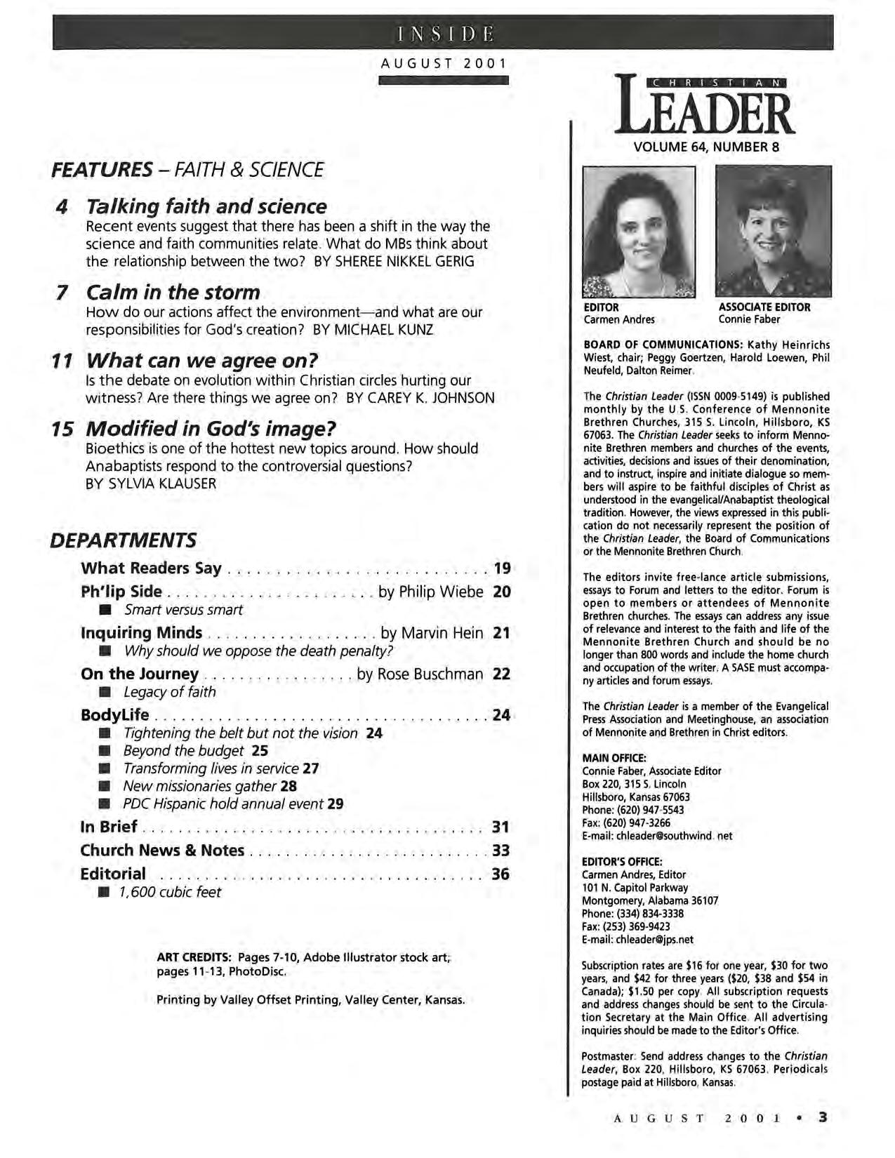 In the ftrst article , Sheree Nikkel Gerig interviewed an MB doctor and several MB professors and scientists to see what they think about the relationship between the faith and science communities. Michael Kunz looks at how our actions affect the environment and what our responsibilities are for God's creation. Carey Johnson takes a different perspective , on the debate about evolution among Christians, challenging us to find what we can agree on. And Sylvia Klauser reflects on the sensitive and timely issues in bioethics.