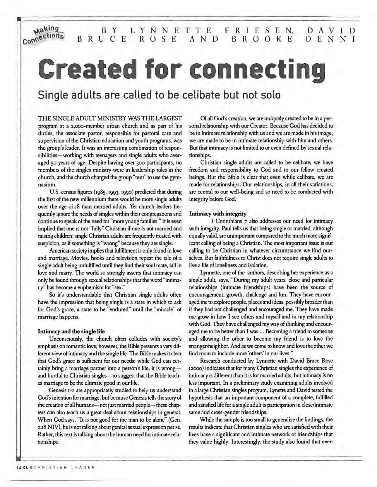 In spite of what our culture suggests, living as a single adult does not mean "enduring" ones existence until the "miracle" of marriage occurs. The single life is not a solo act, but a life lived in relationship with our Creator and his creation. The Bible is clear that we are made for connection and that our relationships, in all their variations, are central to our well-being.