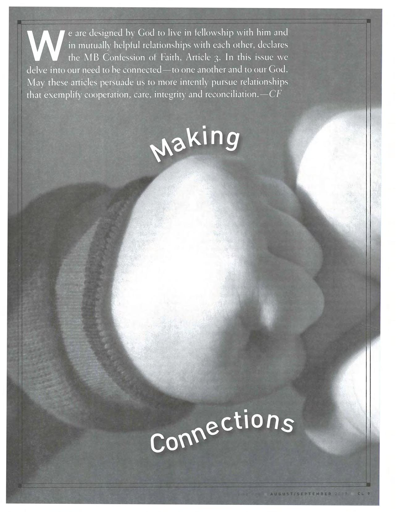 let that stop us from developing the deep connections we long for. Nikki White, in an essay in the July issue of the MB Herald, says it well: "Too often we are content with relational 'snacks: happy to tick church off our to-do list each Sunday without having had one meaningful, uncomfortable encounter with another person, much less with Jesus. Perhaps our Menno-nice approach has become an end in itself, rather than a means to a far more relational end."