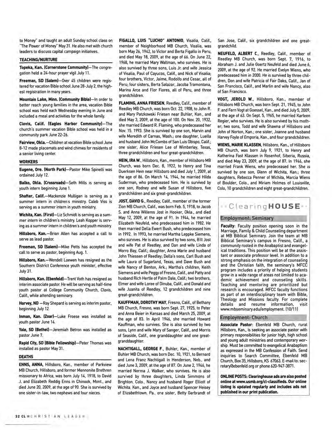Associate Pastor: Ebenfeld MB Church, rural Hillsboro, Kan ., is seeking an associate pastor with primary responsibilities for junior high, high school and young adult ministries and contemporary worship Must be committed to evangelical Anabaptism as expressed in the MB Confession of Faith Send inquiries to Search Committee, Ebenfeld MB Church, Box 35, Hillsboro, KS 67063. E- mail to : secretarylClebenfeld org or phone 620 -947-3871