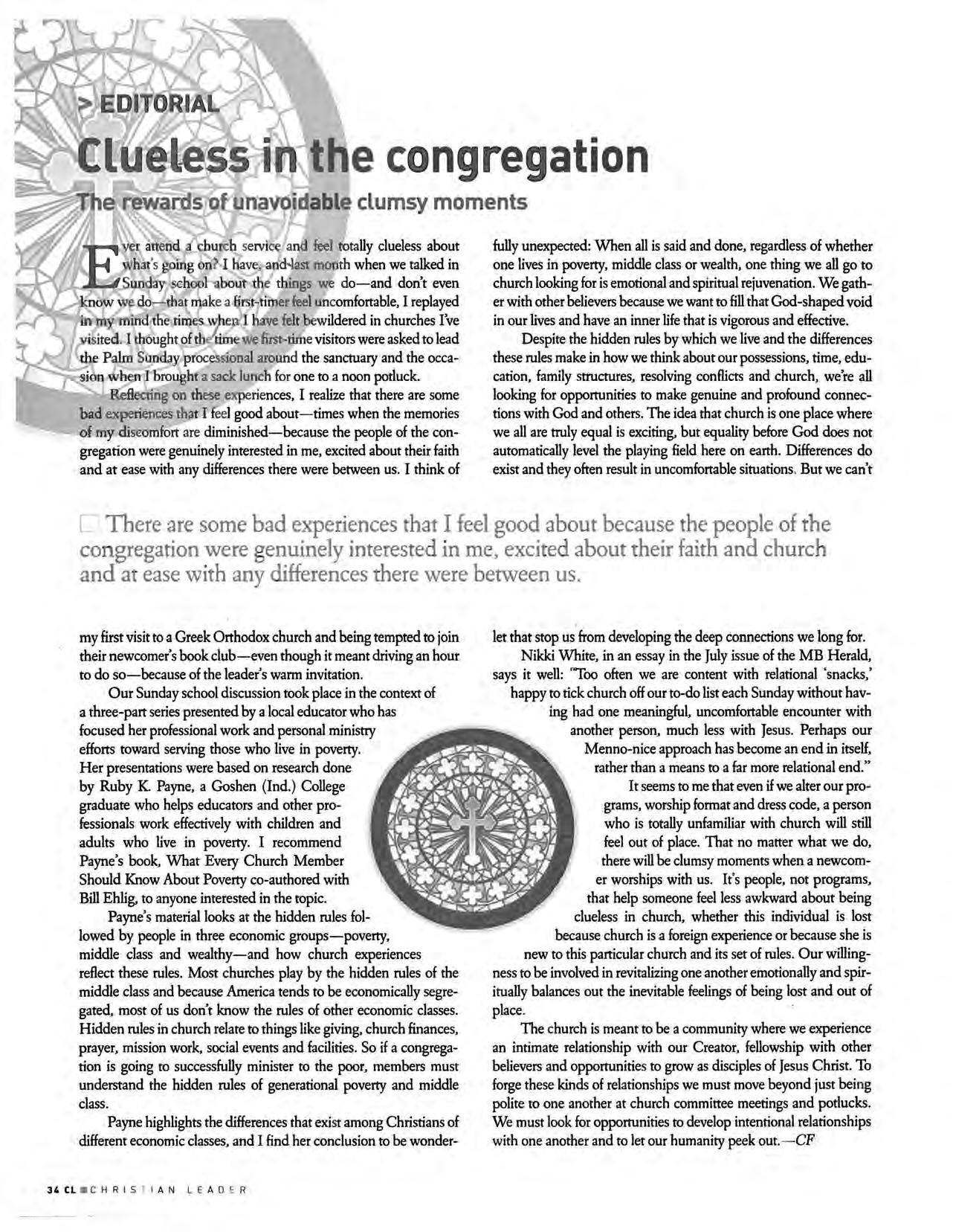 It seems to me that even if we alter our programs, worship format and dress code, a person who is totally unfamiliar with church will still feel out of place. That no matter what we do, there will be clumsy moments when a newcomer worships with us . It's people, not programs, that help someone feel less awkward about being clueless in church, whether this individual is lost because church is a foreign experience or because she is new to this particular church and its set of rules. Our willingness to be involved in revitalizing one another emotionally and spiritually balances out the inevitable feelings of being lost and out of place