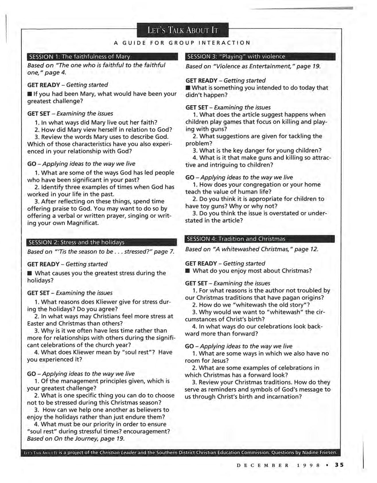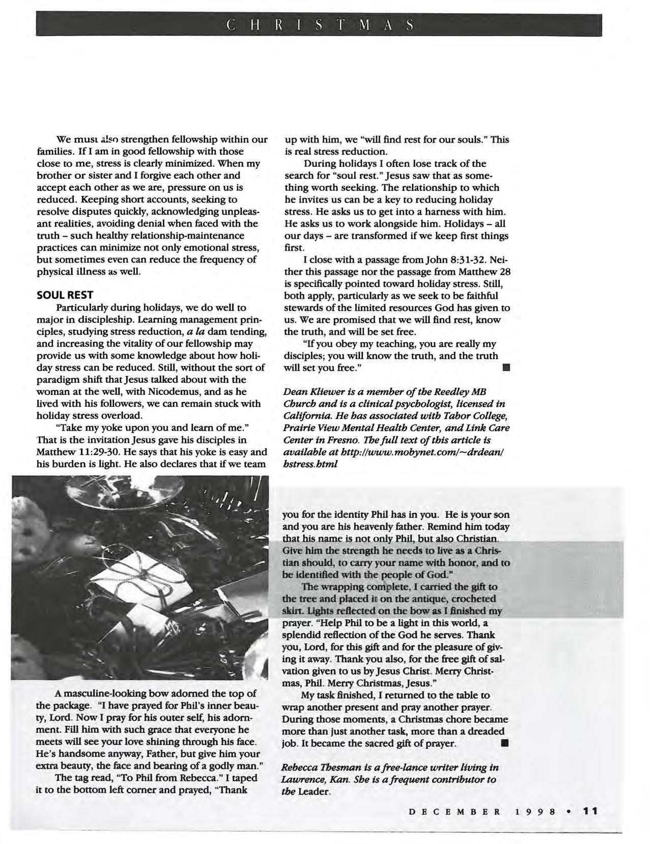 Many of us will be overwhelmed with stress in one form or another during the holiday season. Dean Kliewer gives us some ways to reduce holiday stress and to use the season as way to continue our walk as disciples of Christ. Rebecca Thesman gives a good example of how the ordinary, timeconsuming task of wrapping presents can become a very special time spent with God.