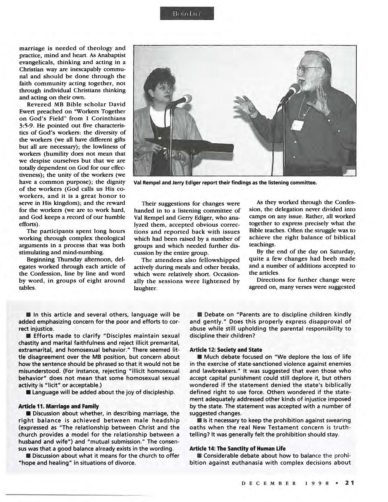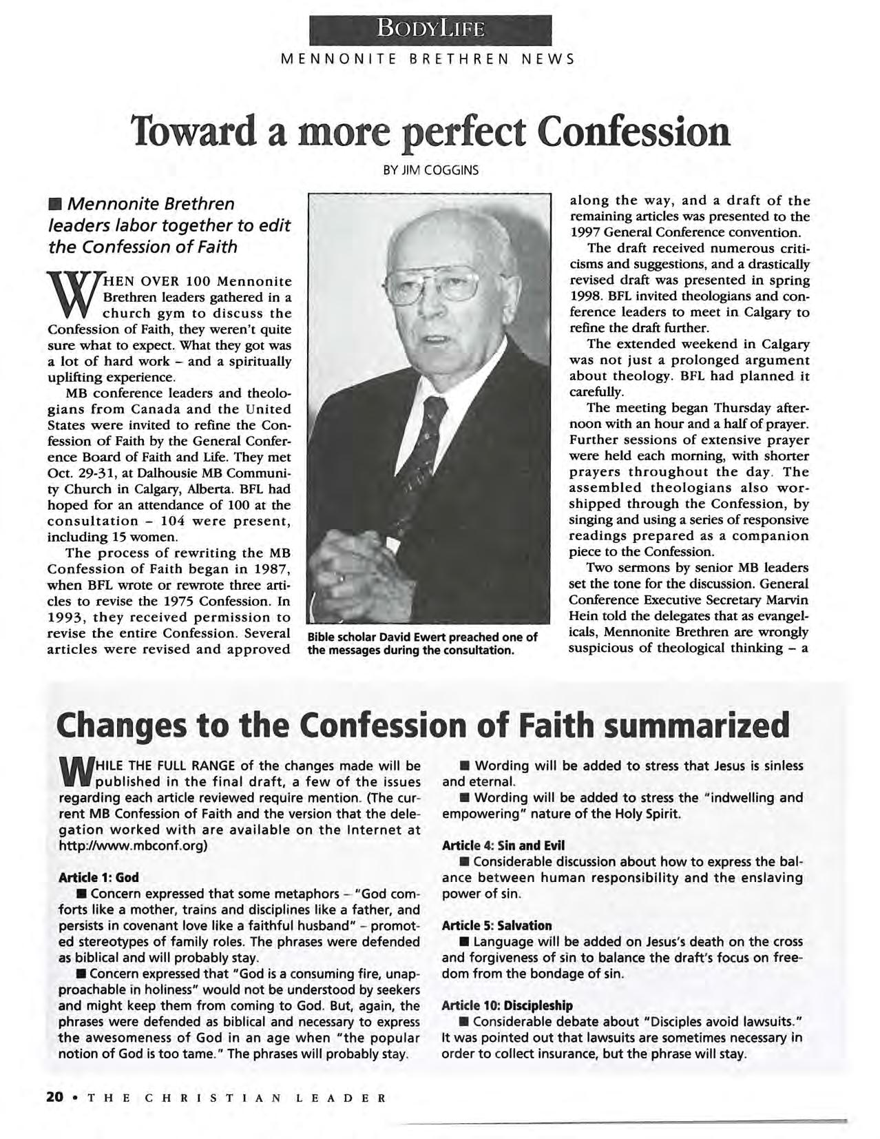differing opinions. But we know how to live with that. I know, because of what I saw at Dalhousie MB Community Church in Calgary. Gathered to rewrite our Confession of Faith, over 100 men and women spoke out of their own distinctive stories, their unique experiences.