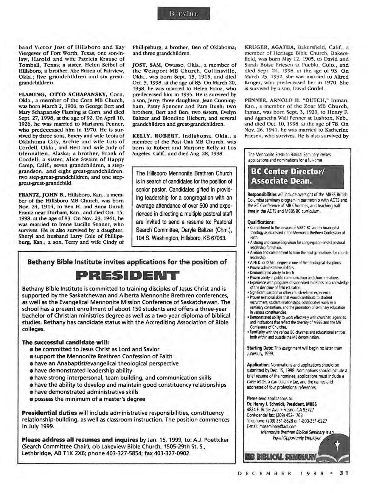 MANDATE: THE CHRISTIAN LEADER (lSSN 00095149), organ of the U.S. Conference of Mennonite Brethren Churches, EDITORIAL ASSISTANT is published monthly by Natalee Roth the U.S Conference Board of Communications, 315 S. Lincoln, Hillsboro, KS 67063. The Christian Leader seeks to inform Mennonite Brethren members and churches of the events, activities, decisions and issues of their denomination, and to instruct, inspire and in itiate dialog so members will asp ire to be faithful disciples of Christ as understood in the evangelical! Anabaptist theological tradition