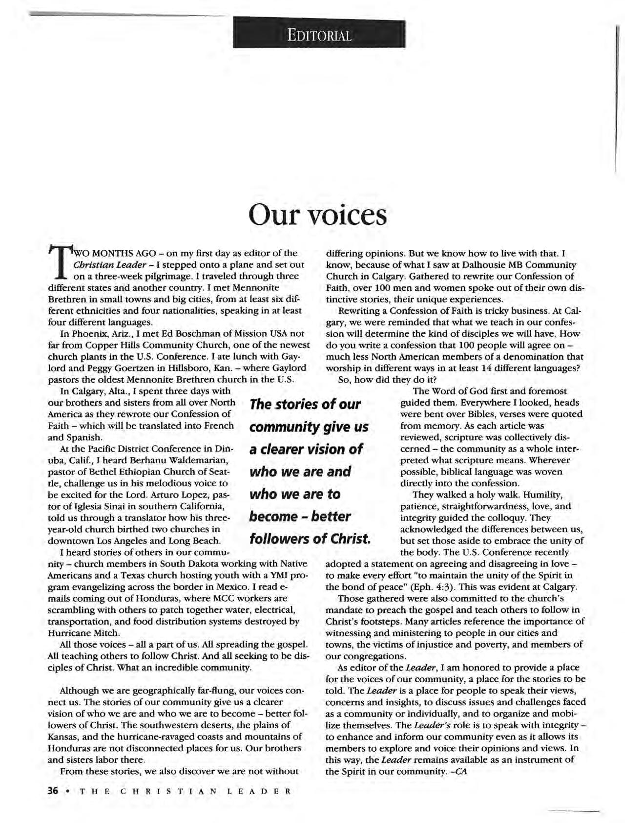 no MONTHS AGO - on my first day as editor of the Christian Leader - I stepped onto a plane and set out on a three-week pilgrimage. I traveled through three different states and another country. I met Mennonite Brethren in small towns and big cities, from at least six different ethnicities and four nationalities, speaking in at least four different languages.