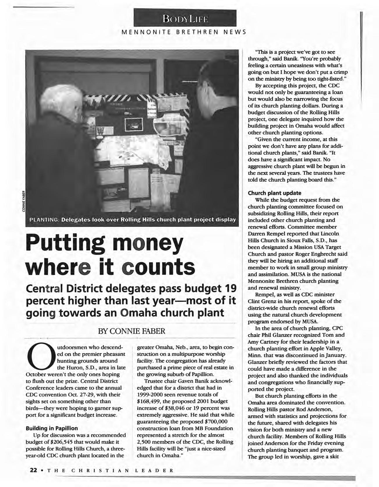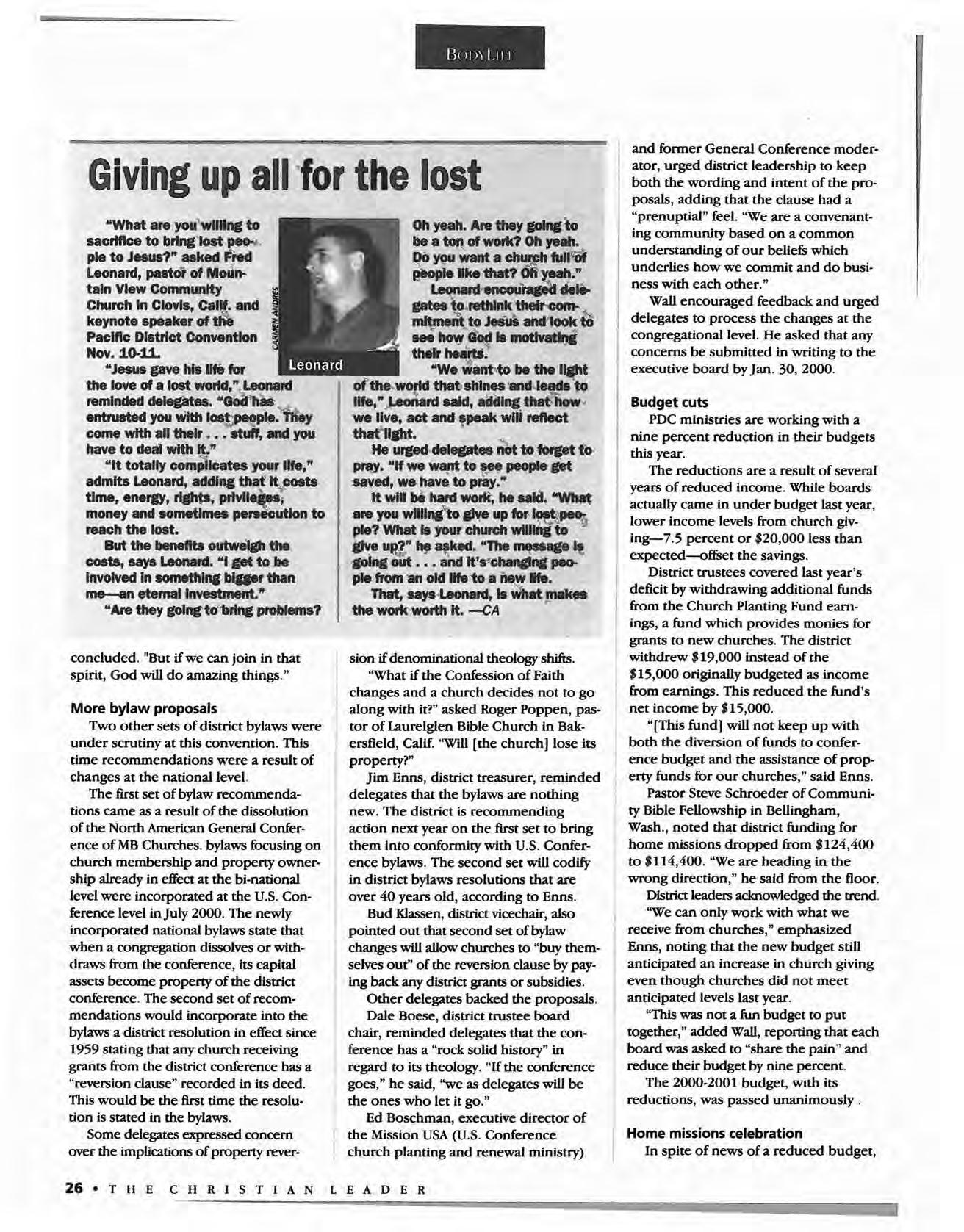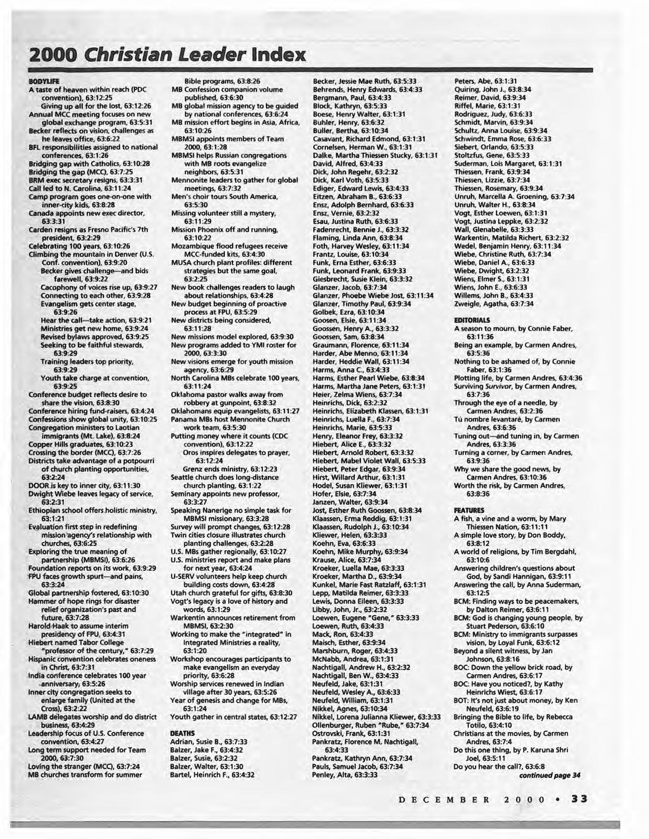 The Christian Leader (ISSN 0009-5149) is published monthly by the U.S. Conference of Mennonite Brethren Churches, 315 S. Lincoln, Hillsboro, KS 67063. The Christian Leader seeks to inform Mennonite Brethren members and churches of the events, activities, decisions and issues of their denomination, and to instruct, inspire and initiate dialog so members will aspire to be faithful disciples of Christ as understood in the evangelicaVAnabaptist theological tradition. However, the views expressed in this publication do not necessarily represent the position of the Christian Leader, the Board of Communications or the Mennonite Brethren Church.