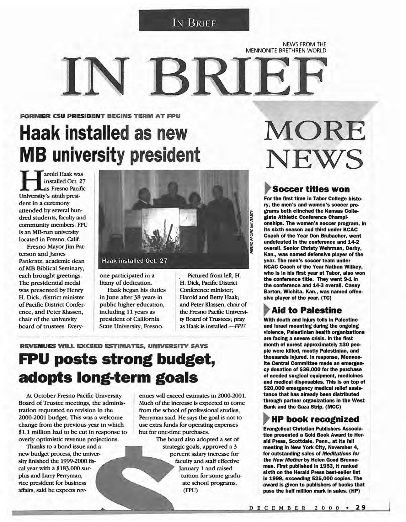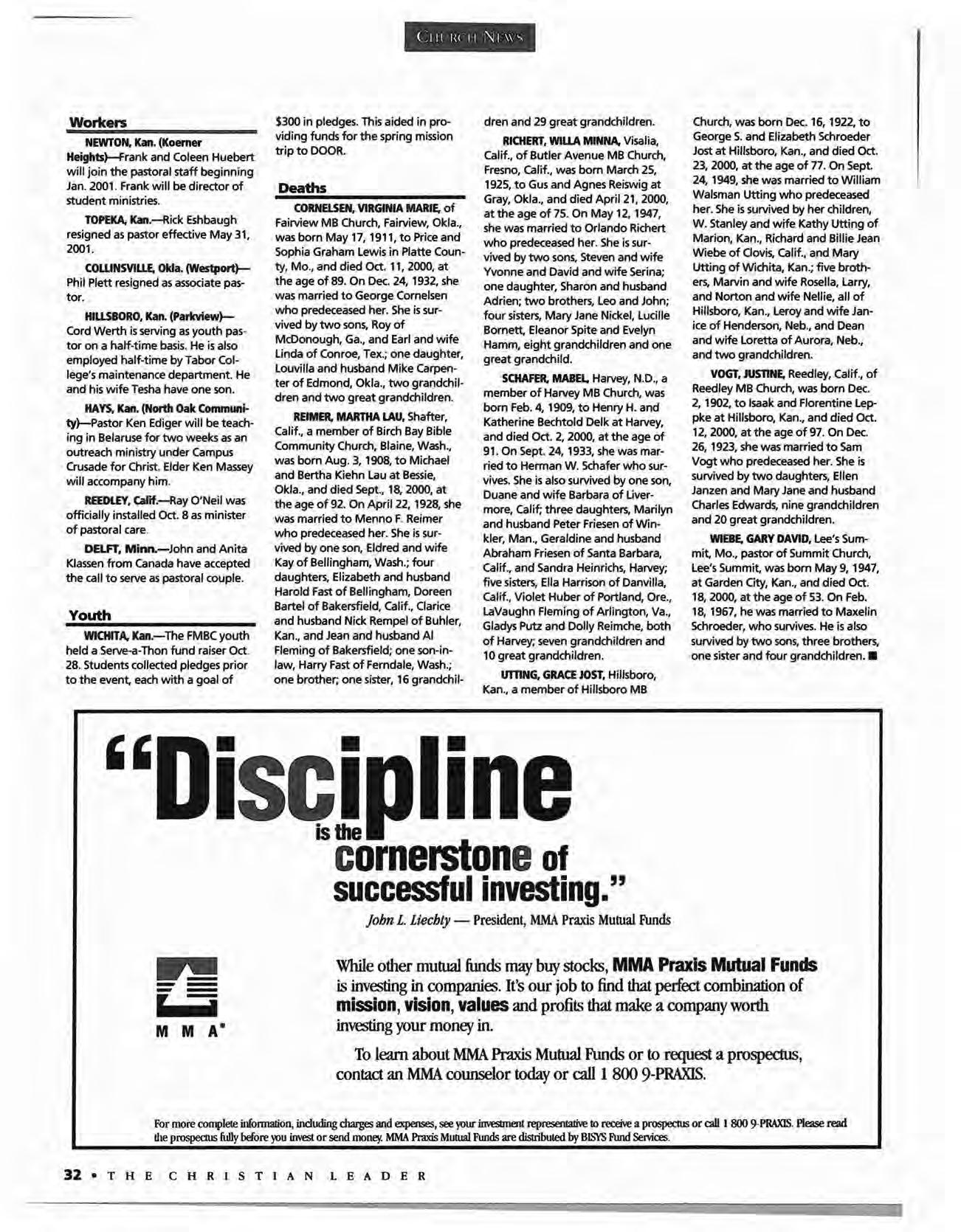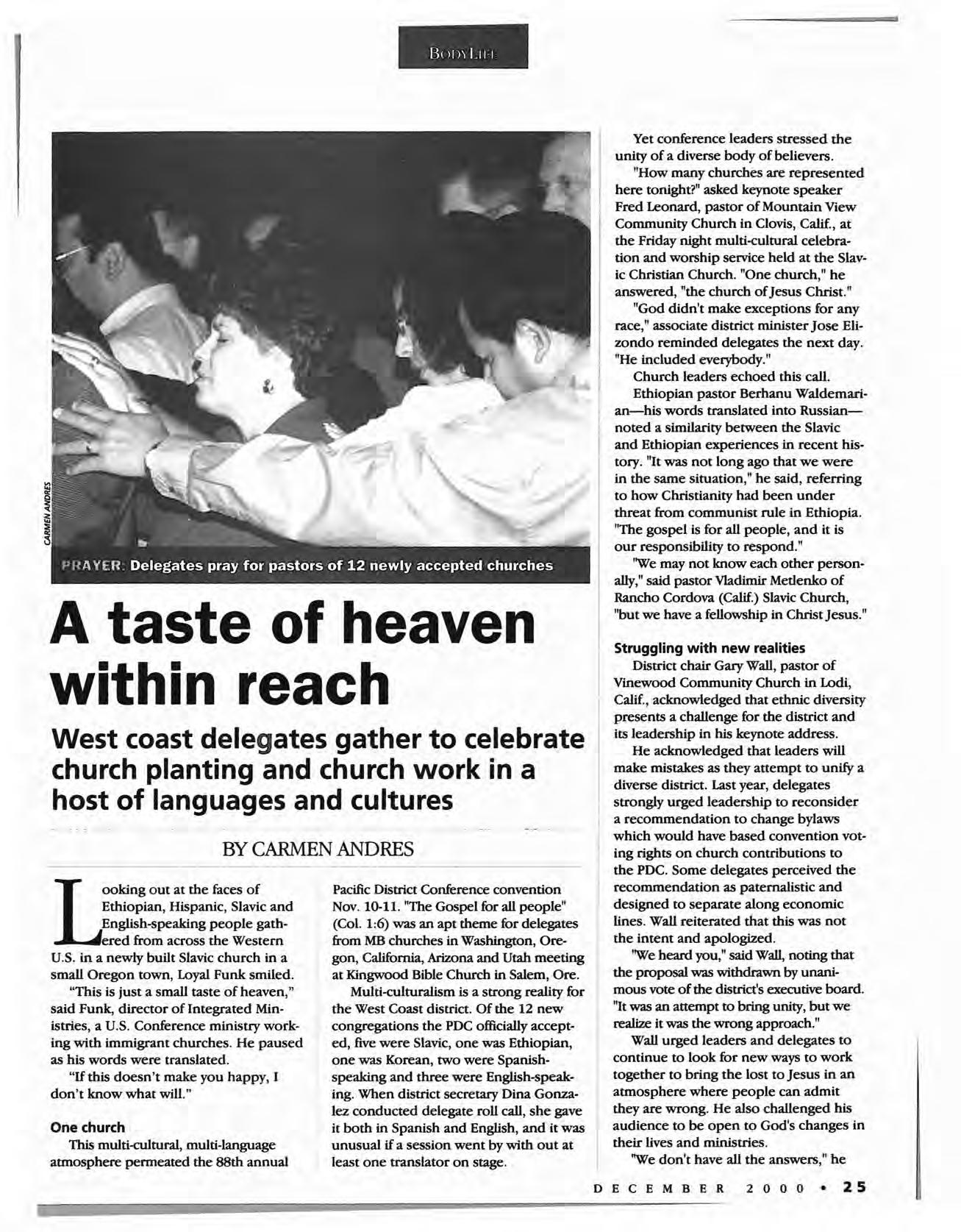 The Christian Leader (ISSN 0009-5149) is published monthly by the U.S. Conference of Mennonite Brethren Churches, 315 S. Lincoln, Hillsboro, KS 67063. The Christian Leader seeks to inform Mennonite Brethren members and churches of the events, activities, decisions and issues of their denomination, and to instruct, inspire and initiate dialog so members will aspire to be faithful disciples of Christ as understood in the evangelicaVAnabaptist theological tradition. However, the views expressed in this publication do not necessarily represent the position of the Christian Leader, the Board of Communications or the Mennonite Brethren Church.