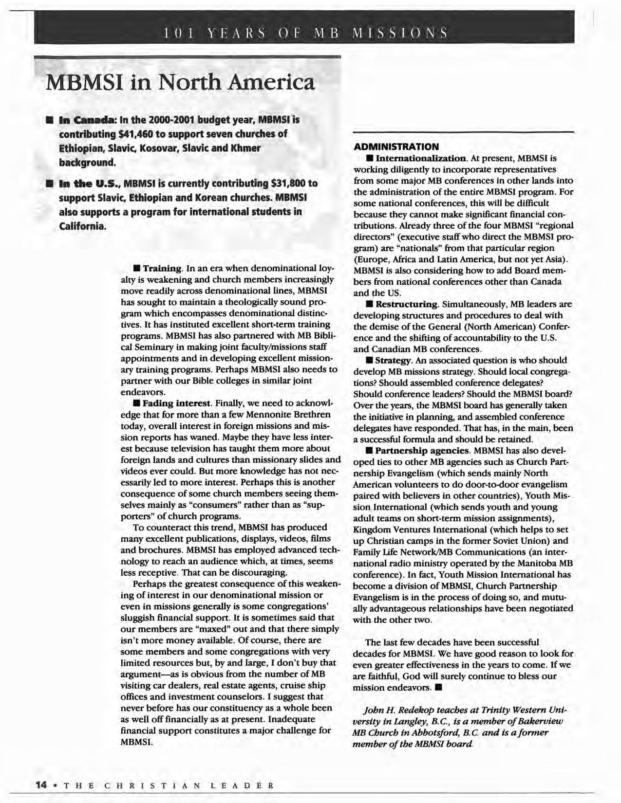 This issue of the Leader focuses on MBMS International, the international mission agency of Mennonite Brethren. The feature articles were jointly commissioned and prepared by the Leader and the MB Herald, a publication of the Canadian Conference of MB Churches.