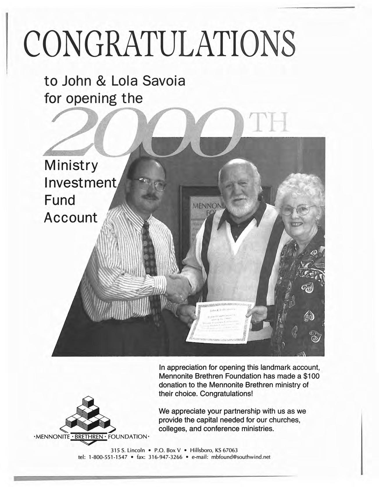 This year, MBMSI celebrated its 100th anniversary. Largely due to the work of MBMSI, MBs have grown from a small immigrant group in the U.S. and Canada to a worldwide denomination with 250,000 members in 20 countries-making MBs the largest Mennonite denomination in the world.