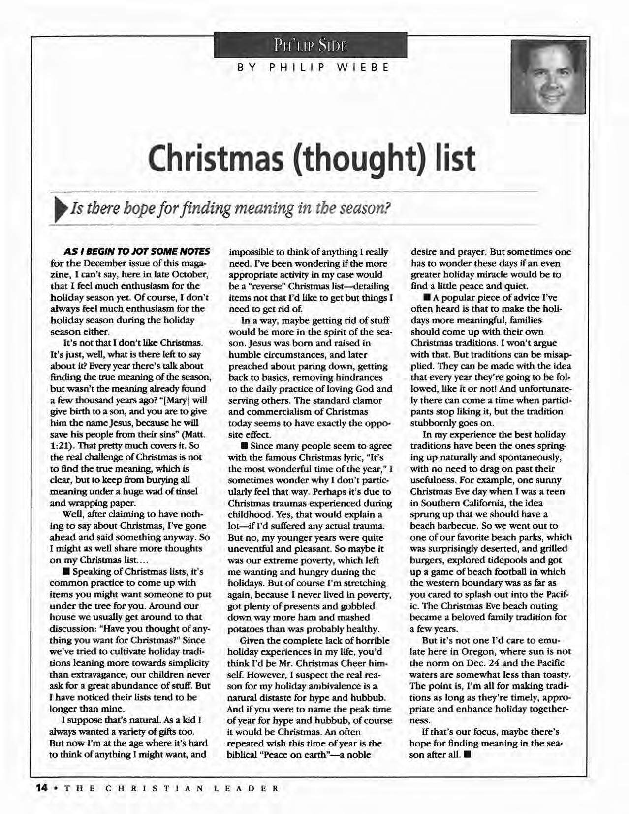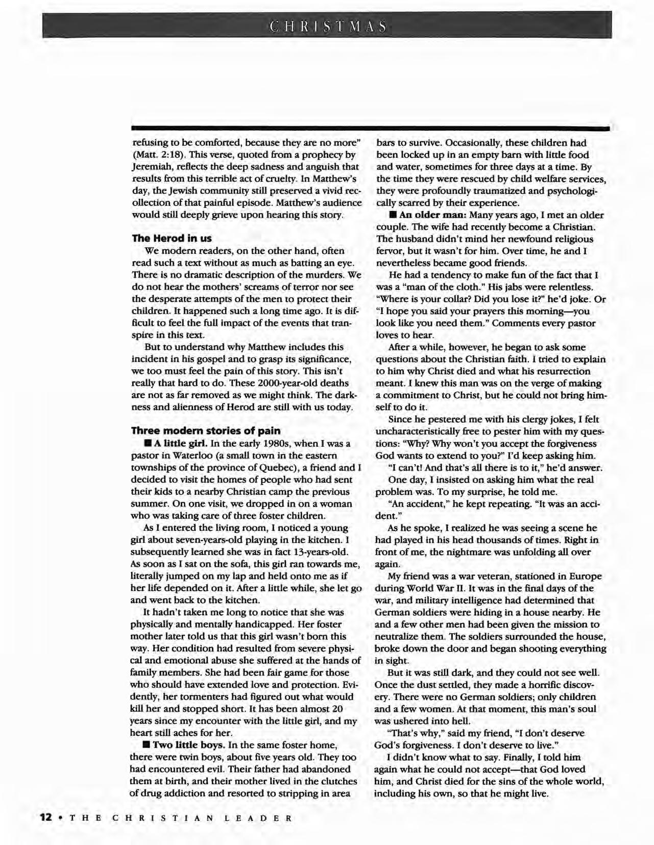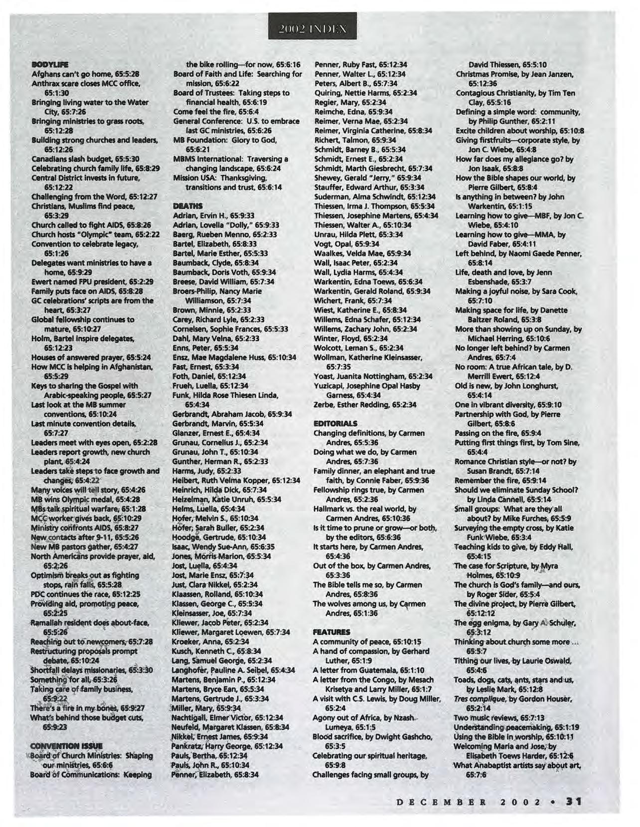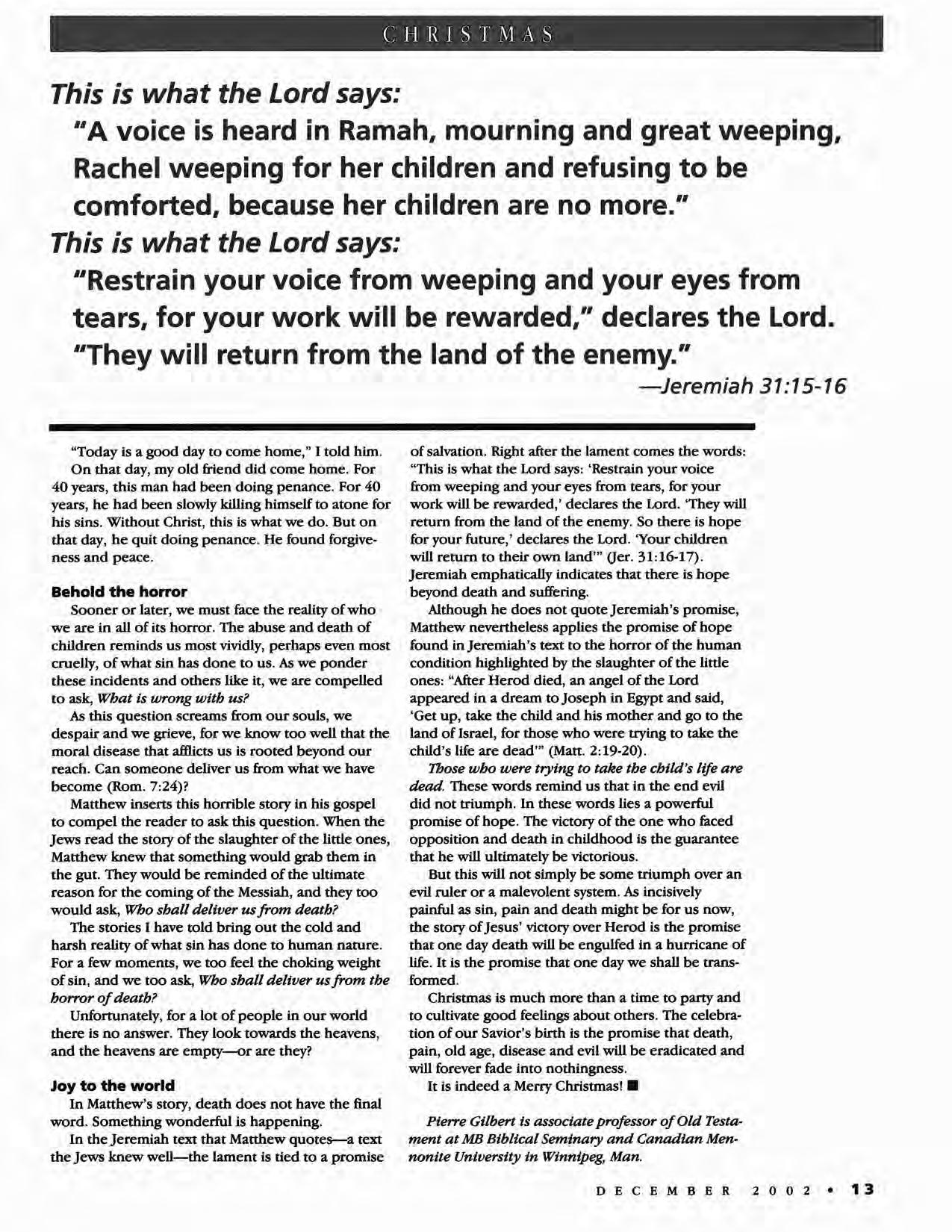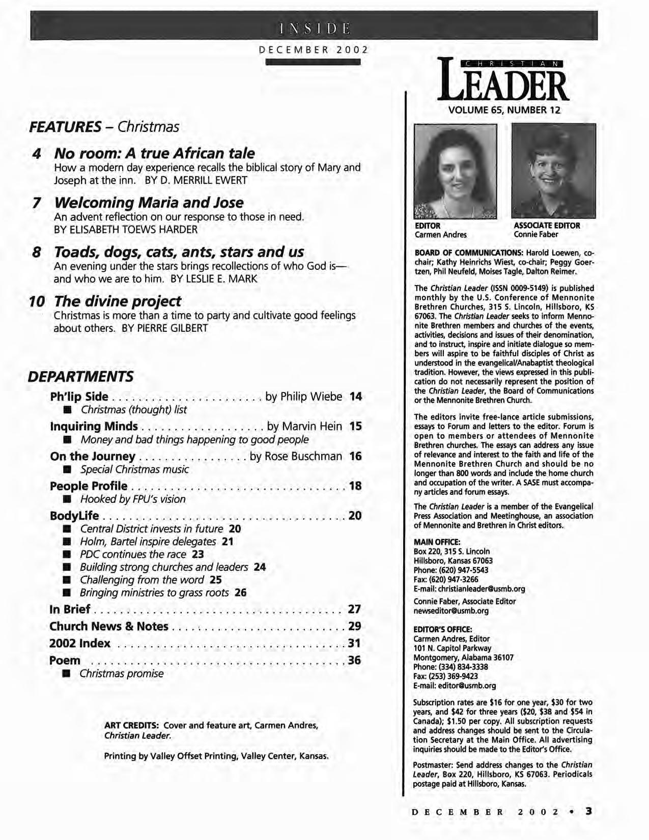 Our feature articles this month explore Christmas and how our lives are affected by God's choice to send new life inJesus. D. Merrill Ewert recalls a personal experience in Africa that parallels the biblical story of Mary and Joseph at the inn, and Elisabeth Toews Harder uses the same story to illustrate our own response to immigrants and the homeless. Leslie E. Mark uses an evening under the stars to reflect on who God is and who we are to him. And Pierre Gilbert looks deeper into God's purpose in sending Jesus.