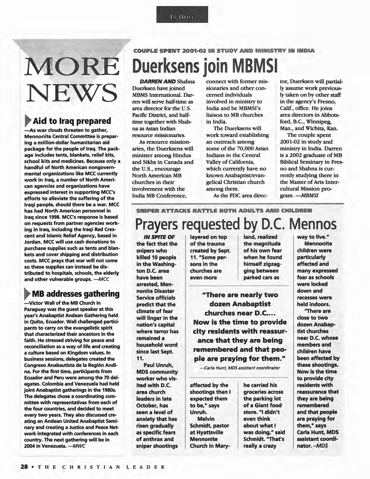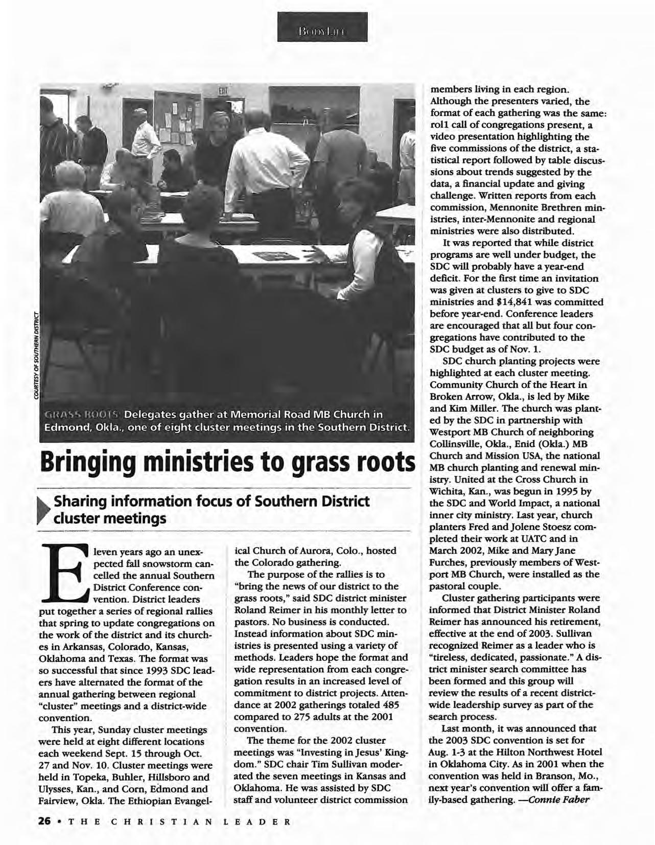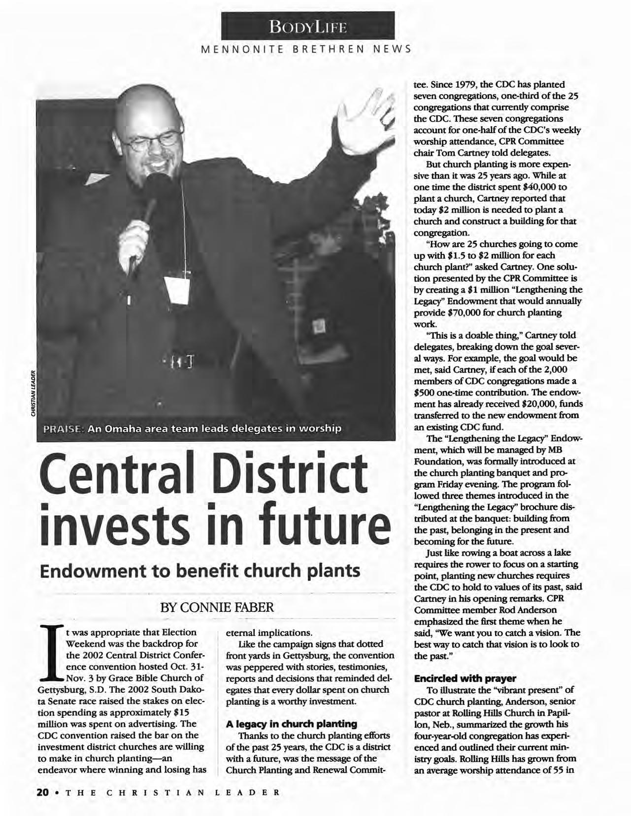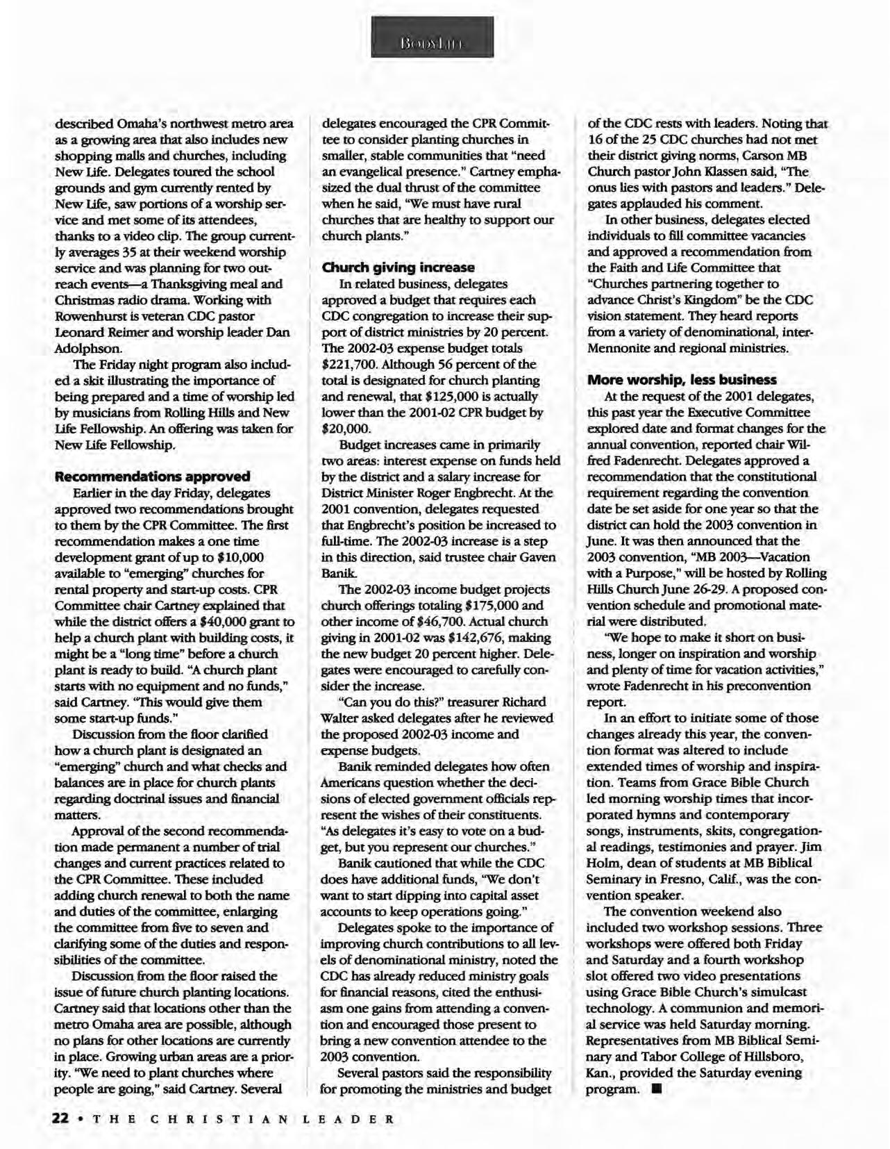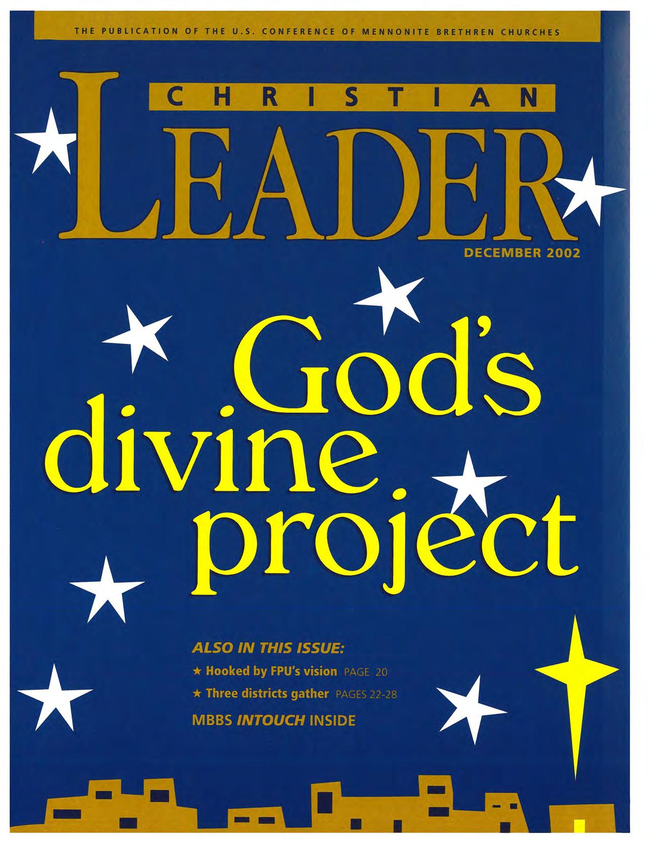 The Christian Leader (ISSN 0009-5149) is published monthly by the U.S. Conference of Mennonite Brethren Churches, 315 S. Lincoln, Hillsboro. KS 67063. The Christian Leader seeks to inform Mennonite Brethren members and churches of the events. activities, decisions and issues of their denomination, and to instruct, inspire and initiate dialogue so members will aspire to be faithful disciples of Christ as understood in the evangelical/Anabaptist theological tradition. However, the views expressed in this publication do not necessarily represent the position of the Christian Leader. the Board of Communications or the Mennonite Brethren Church.