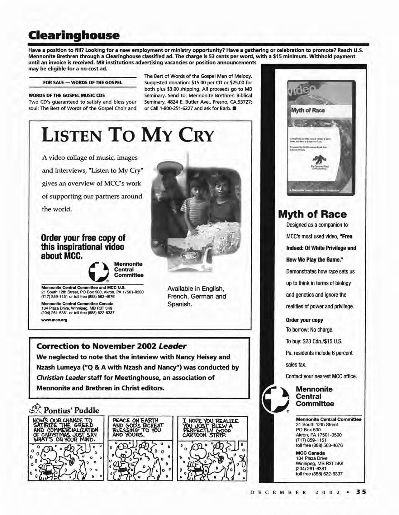 We neglected to note that the inteview with Nancy Heisey and Nzash Lumeya (uQ &A with Nzash and Nancy") was conducted by Christian Leader staff for Meetinghouse, an association of Mennonite and Brethren in Christ editors.