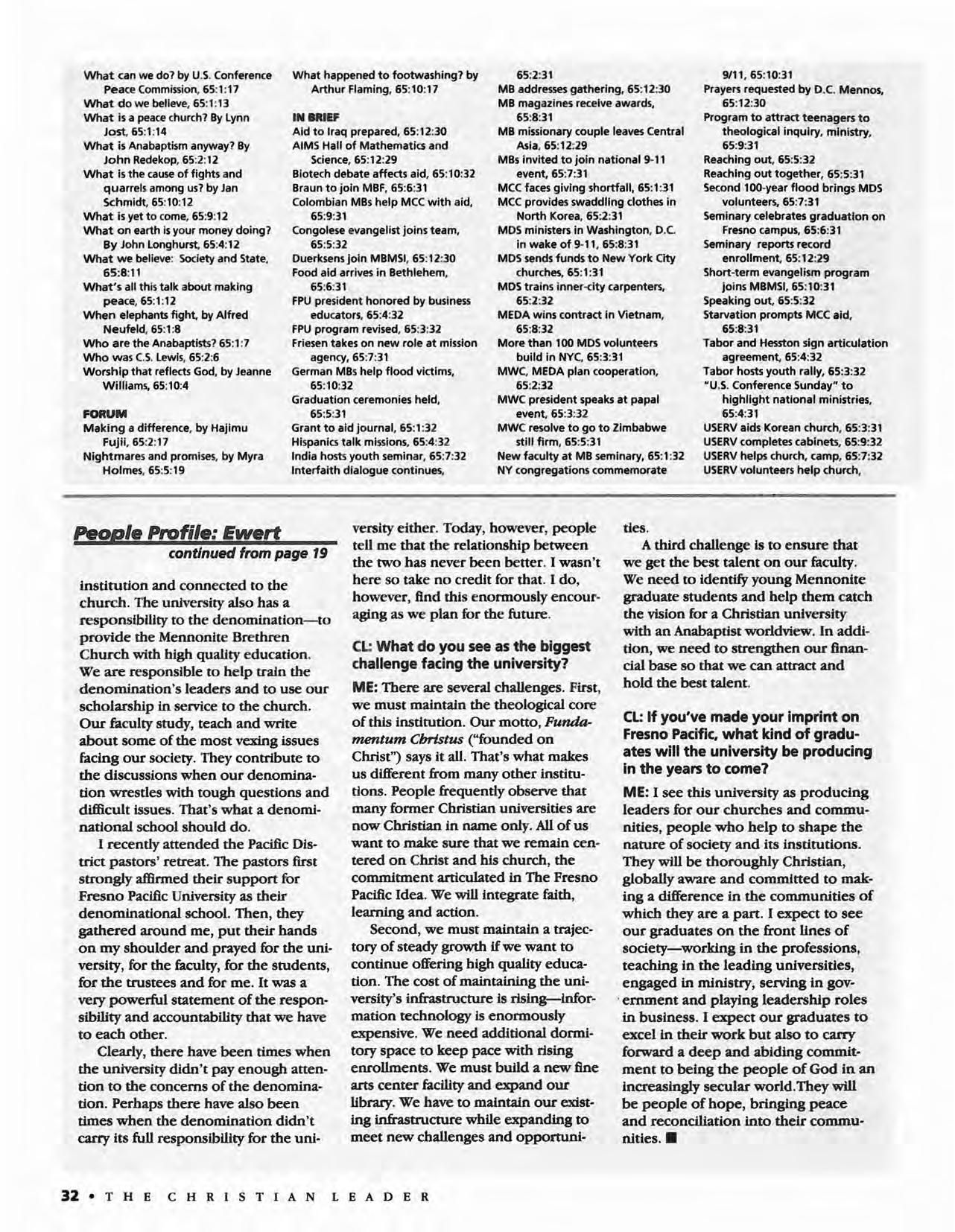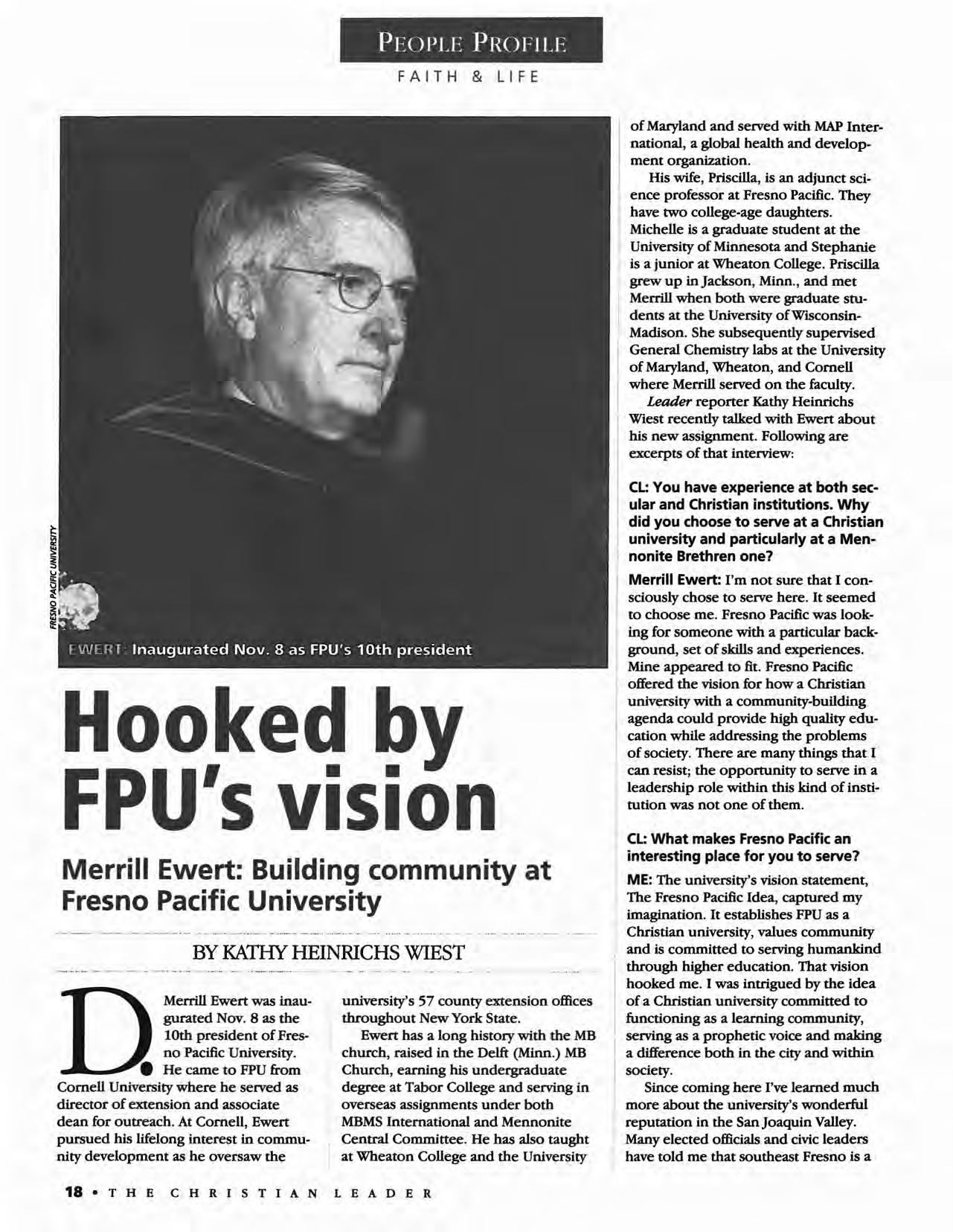 D. Merrill Ewert served with MBMS International from 1967-1969 and Mennonite Central Committee from 1973-1976, spending 1974-76 in Congo. Last month, Ewert was inaugurated as president ofFresno Pacific University, an MB university in Central California.