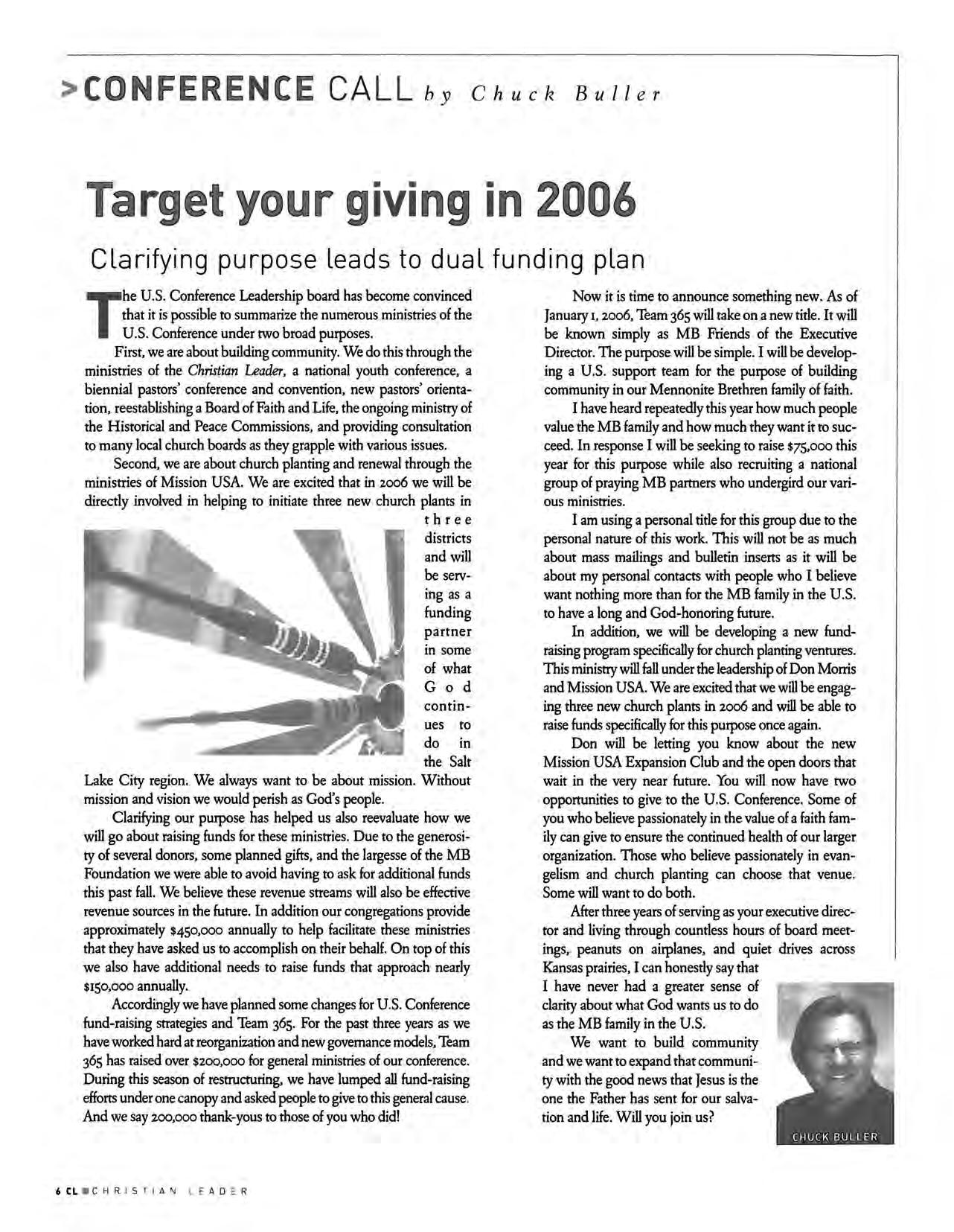 Now it is time to announce something new. As of January I, 2006, Team 365 will take on a new title. It will be known simply as MB Friends of the Executive Director. The purpose will be simple. I will be developing a U.S. support team for the purpose of building community in our Mennonite Brethren family of faith.