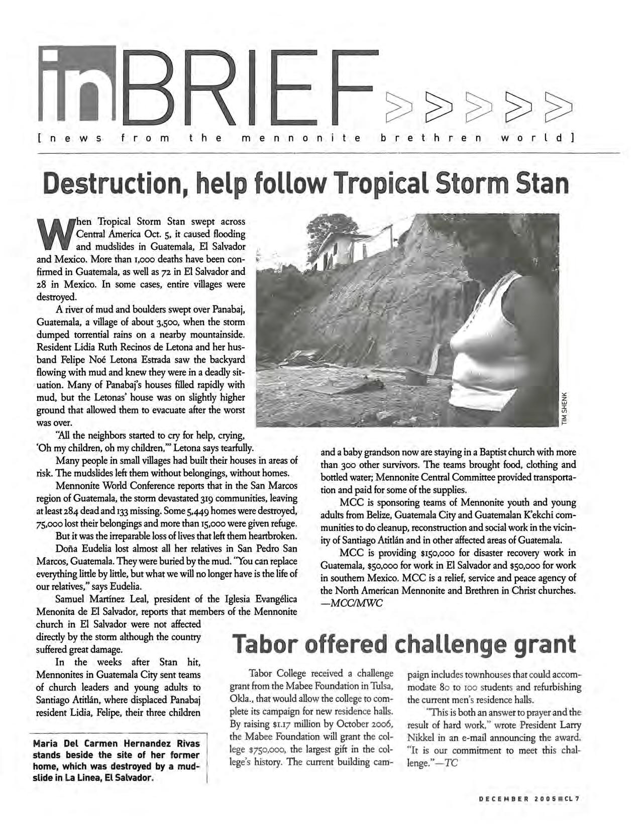 Mennonite World Conference reports that in the San Marcos region of Guatemala, the storm devastated 319 communities, leaving at least 284 dead and 133 missing. Some 5,449 homes were destroyed, 75,000 lost their belongings and more than 15,000 were given refuge.