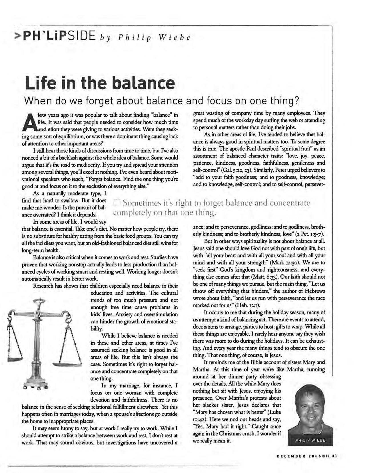 It occurs to me that during the holiday season, many of us attempt a kind of balancing act. There are events to attend, decorations to arrange, parties to host, gifts to wrap. While all these things are enjoyable, I rarely hear anyone say they wish there was more to do during the holidays. It can be exhausting And every year the many things tend to obscure the one thing. That one thing, of course, is Jesus. It reminds me of the Bible account of sisters Mary and Martha. At this time of year we're like Martha, running around at her dinner party obsessing over the details. All the while Mary does nothing but sit with Jesus, enjoying his presence. Over Martha's protests about her slacker sister, Jesus declares that "Mary has chosen what is better" (Luke 10:42). Here we nod our heads and say, "Yes, Mary had it right." Caught once again in the Christmas crush, I wonder if we really mean it.