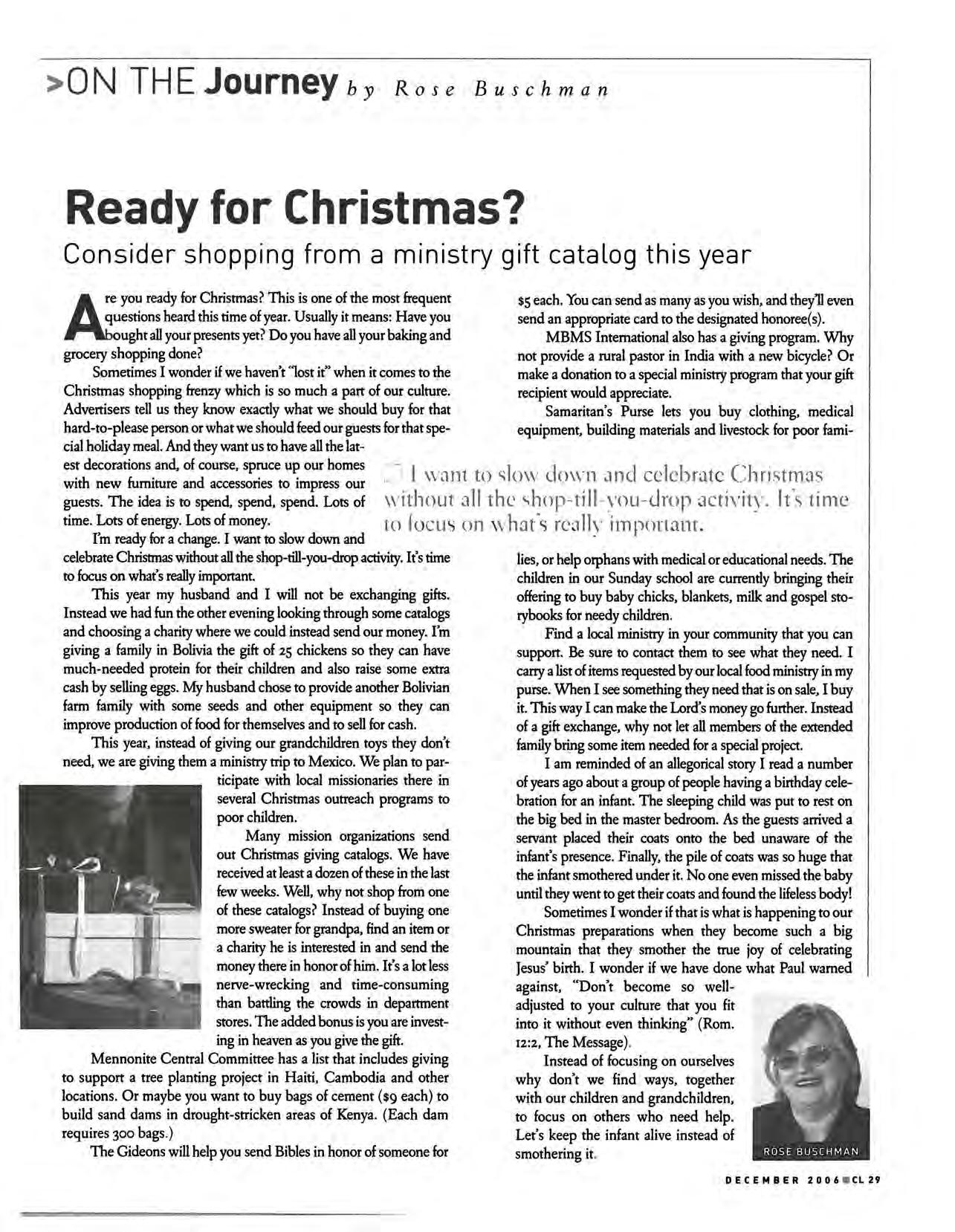 What are you doing this month that is helping your family keep Christ Jesus as the focus of your Christmas celebrations? Please write and tell us about it. You can send a brief description via e-mail to editor®usmb.org or mail it to P.O. Box 220, Hillsboro, KS 67063.