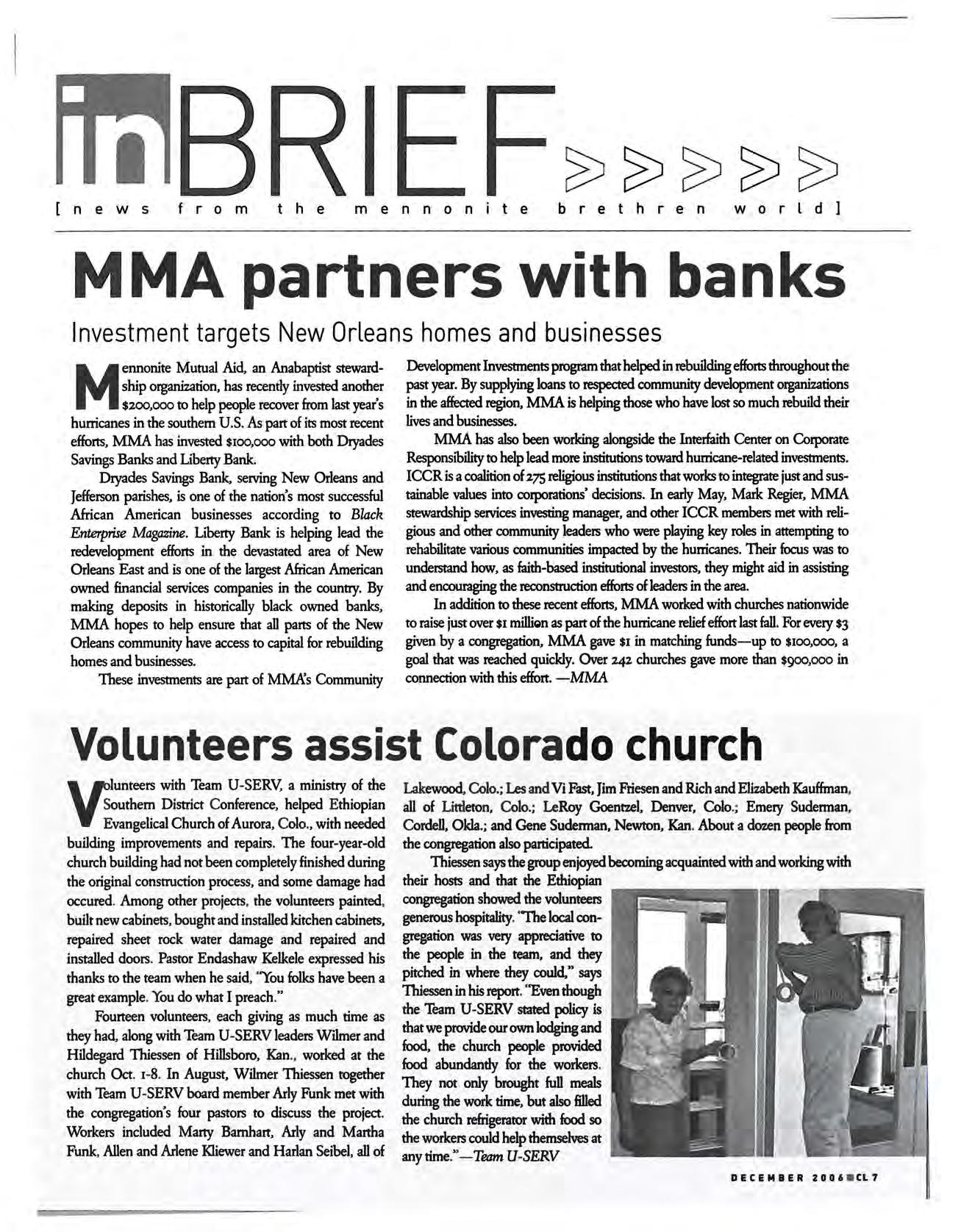 Mennonite Mutual Aid, an Anabaptist stewardship organization, has recently invested another $200,000 to help people recover from last year's hurricanes in the southern U.S. As part of its most recent efforts, MMA has invested $100,000 with both Dryades Savings Banks and Liberty Bank.