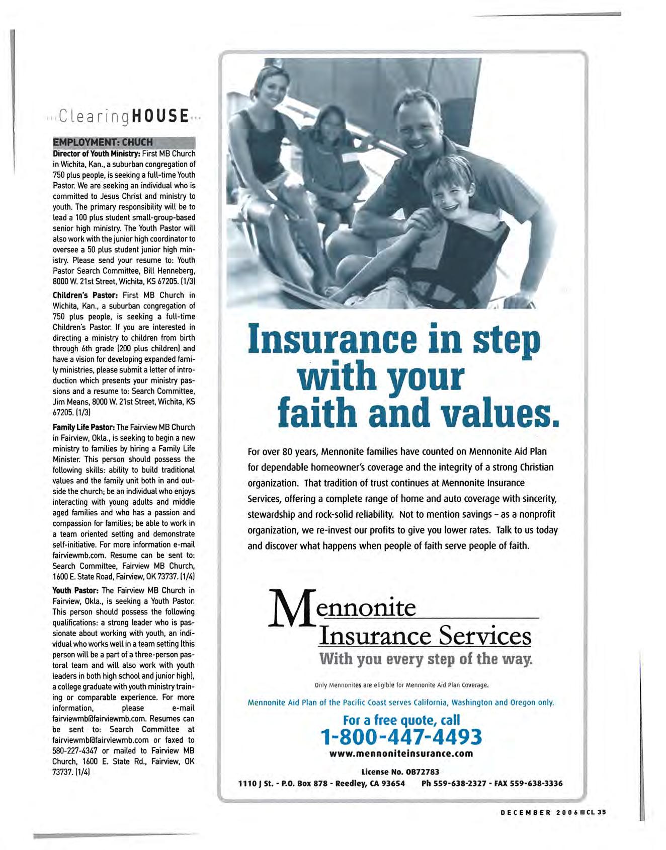 Family Life Pastor: The Fairview MB Church in Fairview, Okla., is seeking to begin a new ministry to families by hiring a Family Life Minister. This person should possess the following skills: ability to build traditional values and the family unit both in and outside the church; be an individual who enjoys interacting with young adults and middle aged families and who has a passion and compassion for families; be able to work in a team oriented setting and demonstrate self-initiative. For more information e-mail fairviewmb.com Resume can be sent to: Search Committee, Fairview MB Church, 1600 E State Road, Fairview, OK 73737.11/41