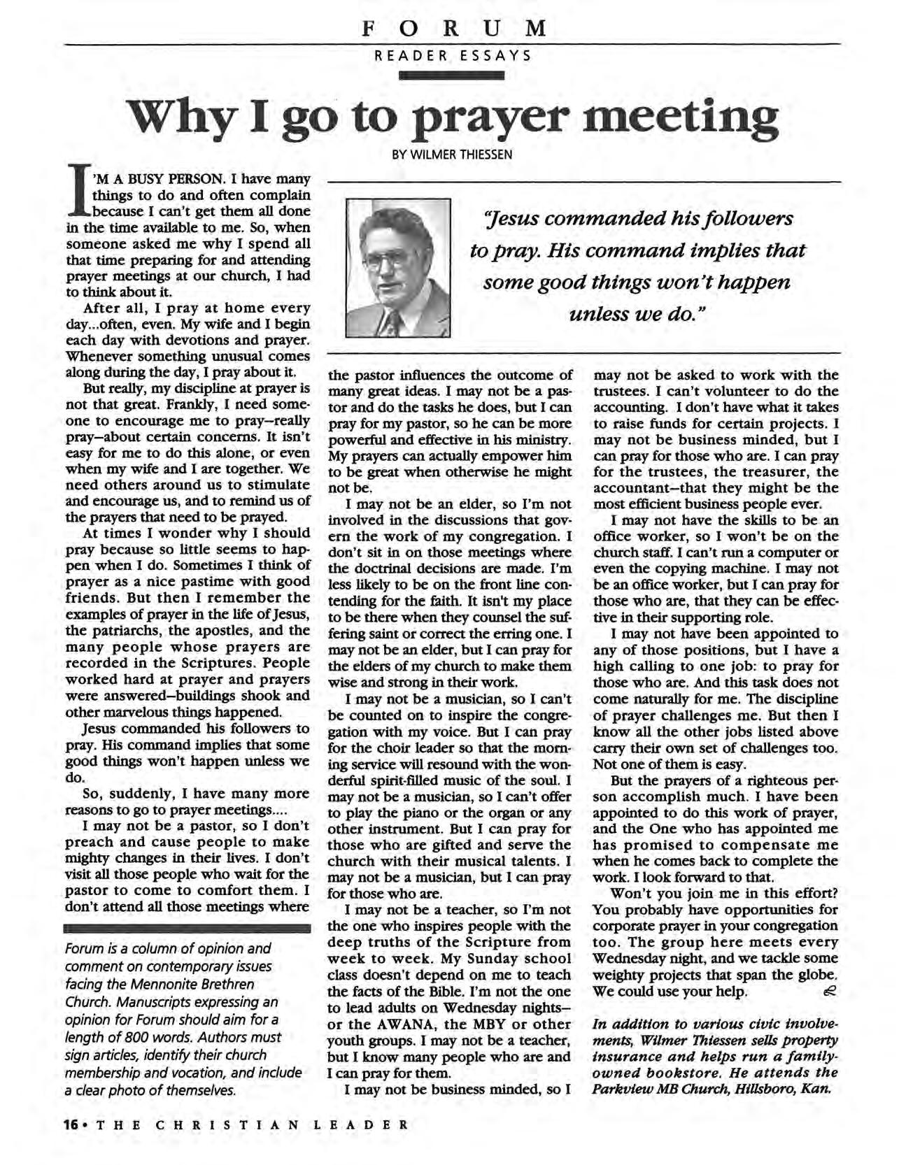 READER PARTICIPATION: The editors encourage readers to interact with our articles through letters to the editor and essays to Forum, our op-ed column. Letters for What Readers Say must include the author's name and address Forum is open to members or attenders of Mennonite Brethren churches Essays to Forum can address any issue of relevance and interest to the faith and life of the Mennonite Brethren Church. The essay should be no longer than 800 words and should include the home church, occupation and a clear photo of the writer.