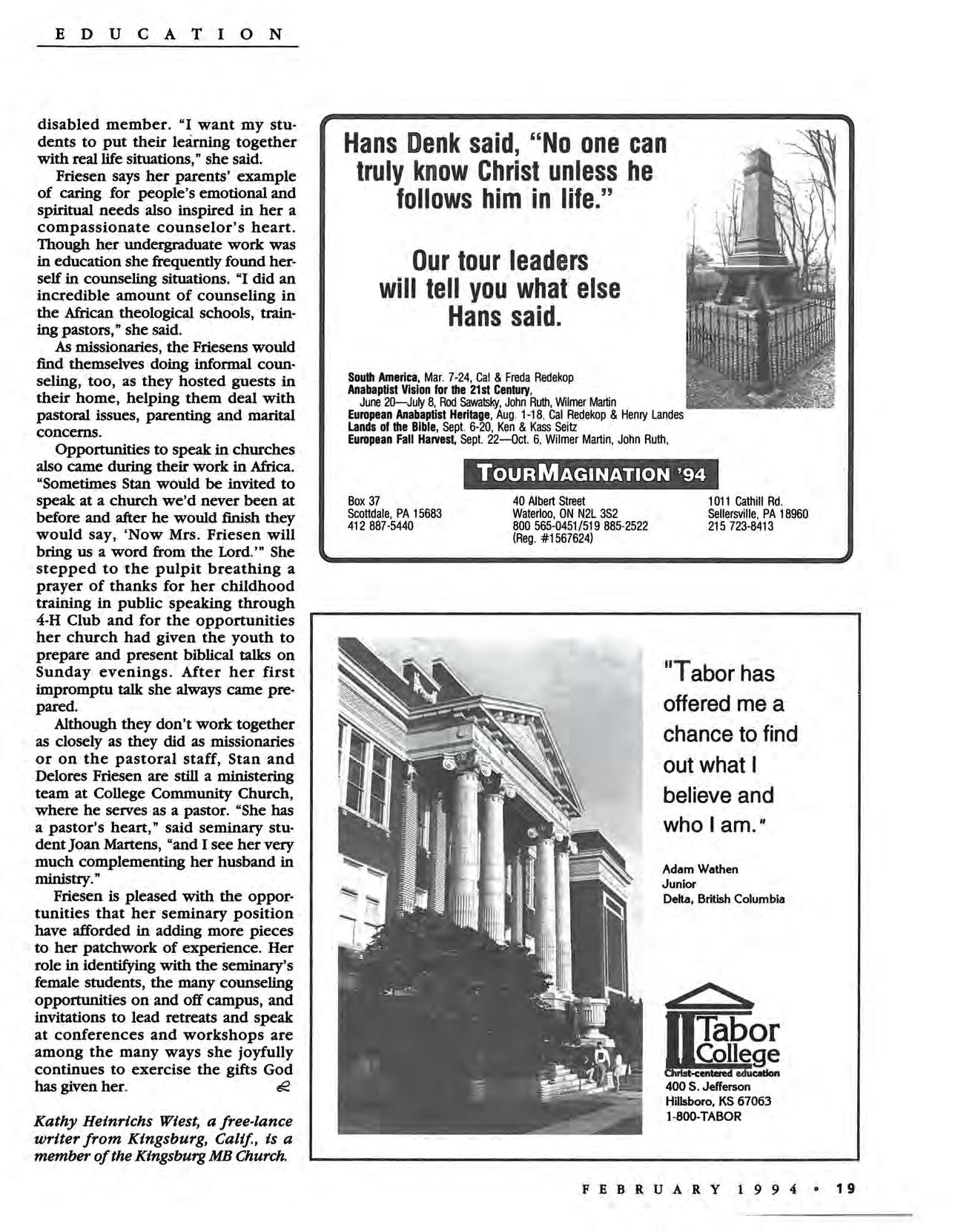 MAN DATE: THE CHRISTIAN LEADER (ISSN 00095149), organ of the U S. Conference of Mennonite Brethren Churches, is published monthly by the U.S Conference Board of Communications, 315 S Lincoln, Hillsboro, KS 67063. The Christian Leader seeks to inform Mennonite Brethren members and churches of the events, activities, decisions, and issues of their denomination, and to instruct, inspire and initiate dialog so that they will aspire to be faithful disciples of Christ as understood in the evangelical!Anabaptist theological tradition