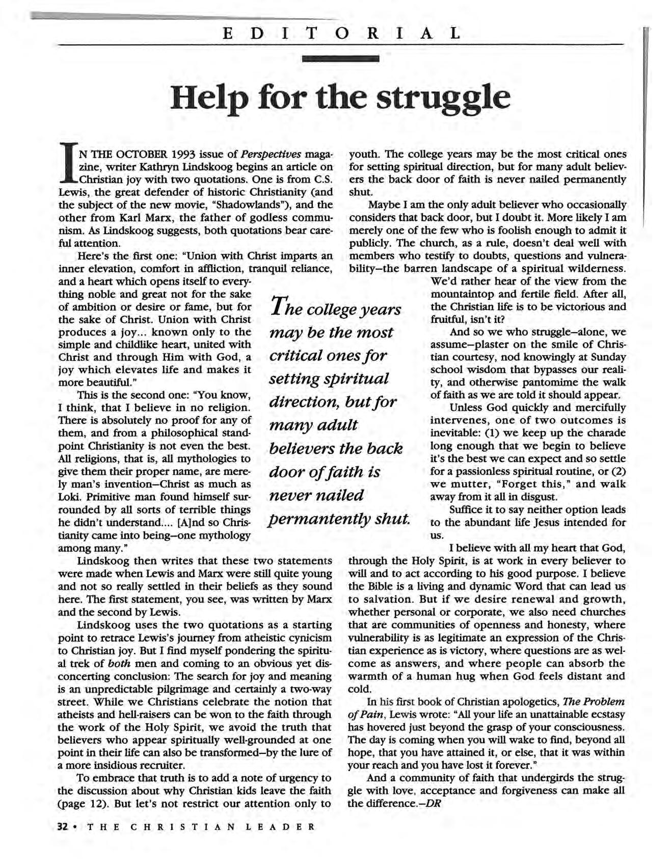 IN mE OcrOBER 1993 issue of Perspectives magazine, writer Kathryn Lindskoog begins an article on Christian joy with two quotations. One is from e.s. Lewis, the great defender of historic Christianity (and the subject of the new movie, "Shadowlands"), and the other from Karl Marx, the father of godless communism. As Lindskoog suggests, both quotations bear careful attention.
