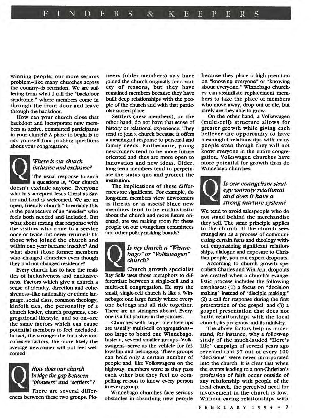 THE PROCESS of "finding" people who need the Lord and his church is hard enough for most of our congregations. That makes "keeping" the ones we attract all the more important if we want to grow numeri· cally and spiritually. When it comes to newcomers, too often for us it's in one door and eventually out the other.