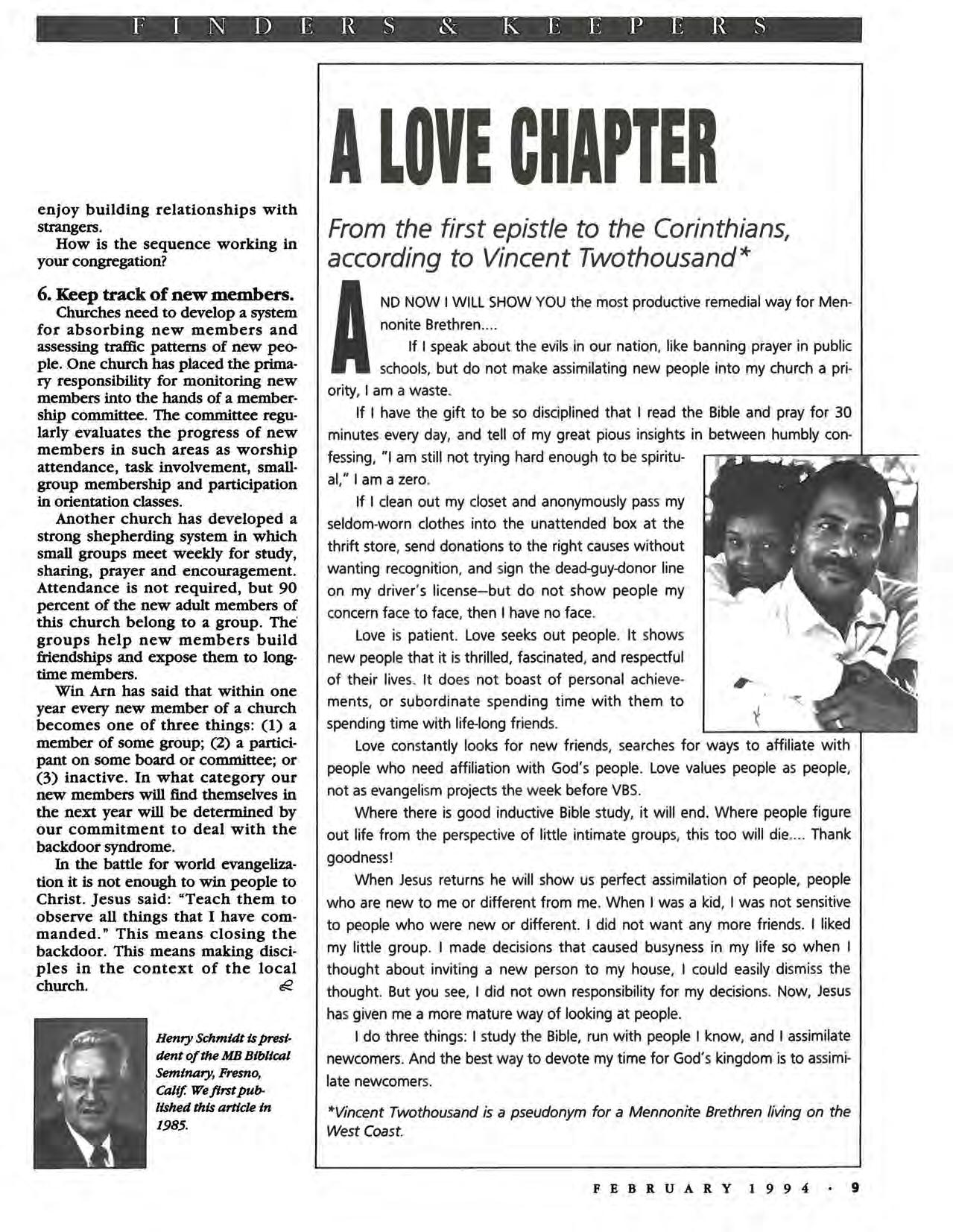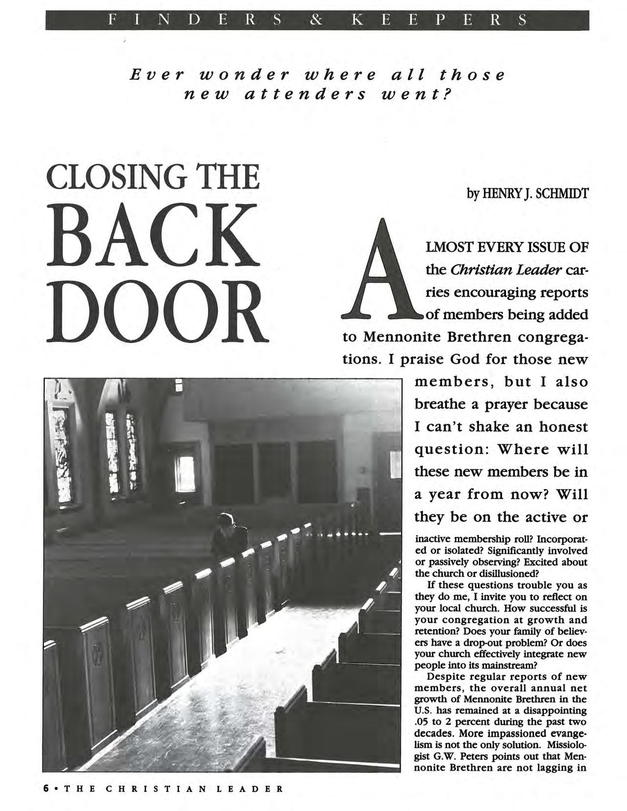 the Christian Leader carries encouraging reports of members being added to Mennonite Brethren congregations. I praise God for those new members, but I also breathe a prayer because I can't shake an honest question: Where will these new members be in a year from now? Will they be on the active or inactive membership roll? Incorporated or isolated? Significantly involved or passively observing? Excited about the church or disillusioned?
