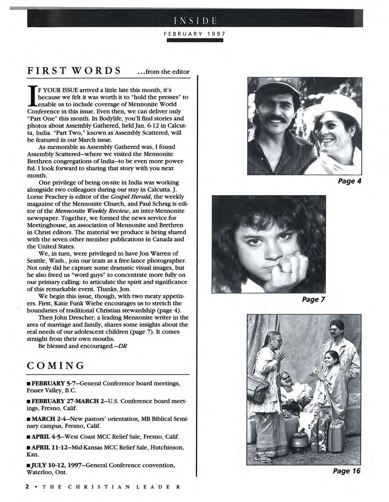 F YOUR ISSUE arrived a little late this month, it's because we felt it was worth it to "hold the presses" to enable us to include coverage of Mennonite World Conference in this issue . Even then, we can deliver only "Part One" this month. In Bodylife, you'll find stories and photos about Assembly Gathered, held Jan. 6-12 in Calcutta, India "Part Two," known as Assembly Scattered, will be featured in our March issue.