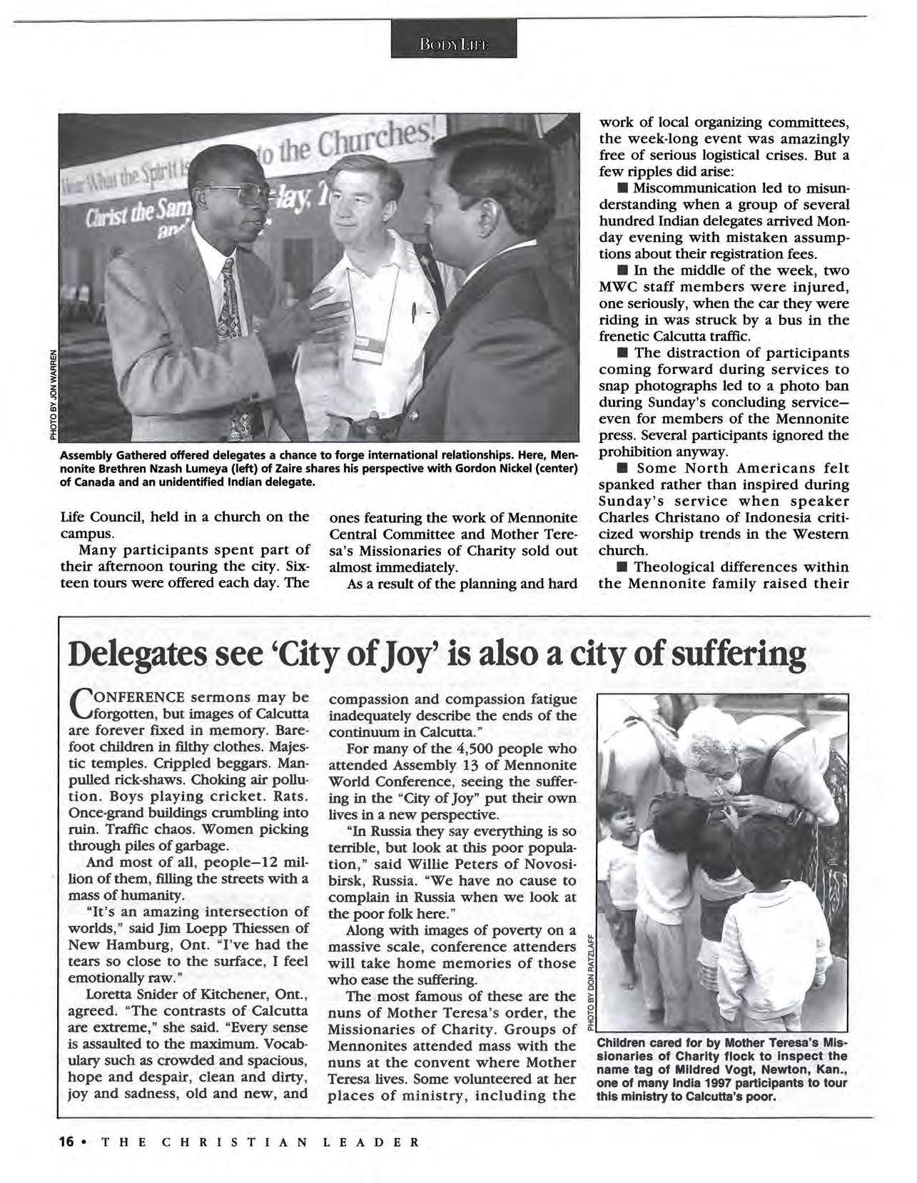 matter of days. The temporary nature of our meeting place in Calcutta symbolized the reality that became evident during Assembly Gathered: the Holy Spirit does not take up permanent residence either. Yes, the Spirit continues to work in the Mennonite "homelands" of Europe and North America, but the locus of the Spirit's most dramatic activity has shifted to Asia, Africa and Latin America. We North Americans may have institutions of brick and mortar, but the Two-Thirds World has a church on the move.