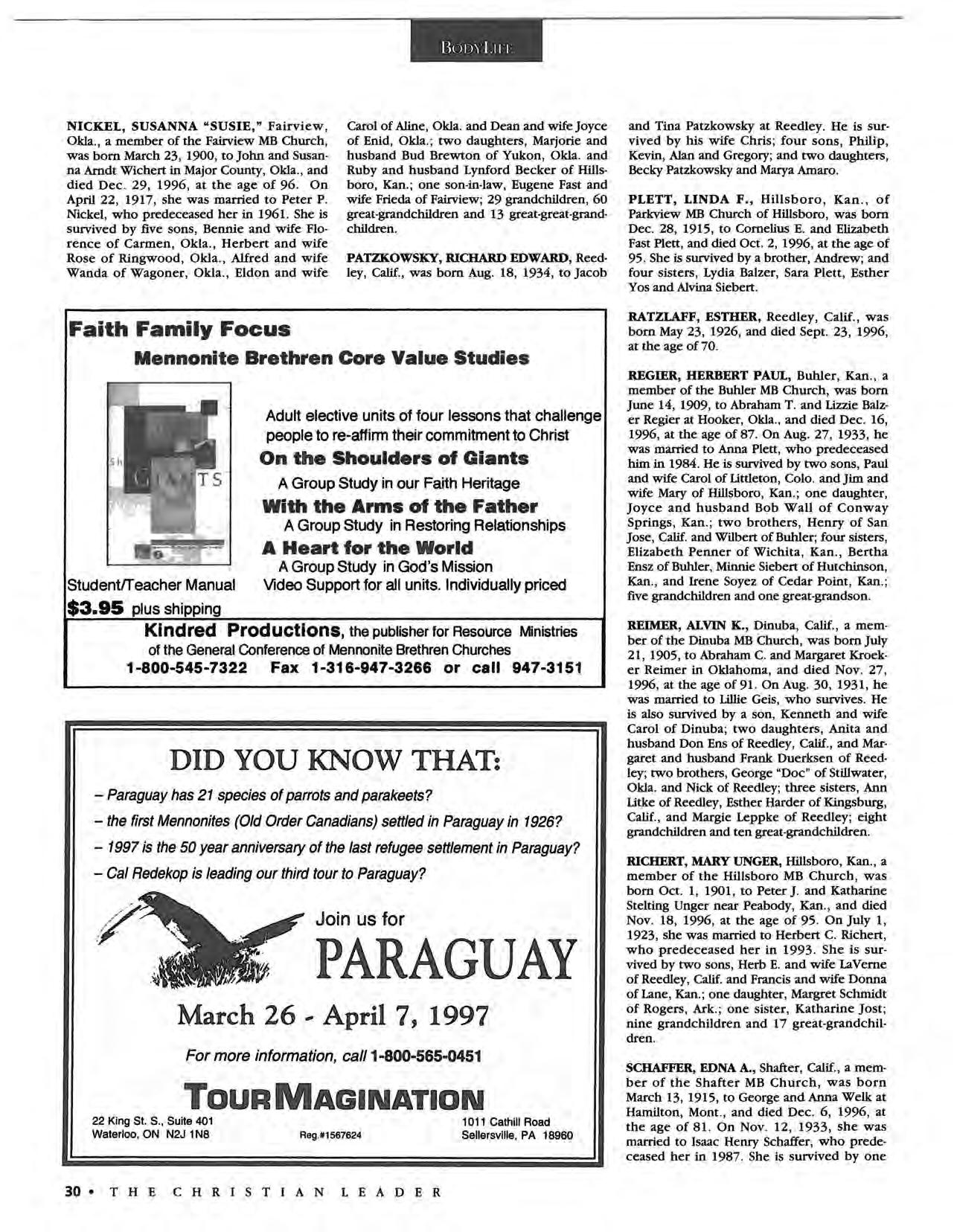 MANDATE: THE CHRISTIAN LEADER (ISSN 00095149), organ of the U.S Conference of Mennonite Brethren Churches, is published monthly by the U.S. Conference Board of Communications, 315 S. Lincoln, Hillsboro, KS 67063. The Christian Leader seeks to inform Mennonite Brethren members and churches of the events, activities, decisions, and issues of their denomination, and to instruct, inspire and initiate dialog so that they will aspire to be faithful disciples of Christ as understood in the evangelical! Anabaptist theological tradition.