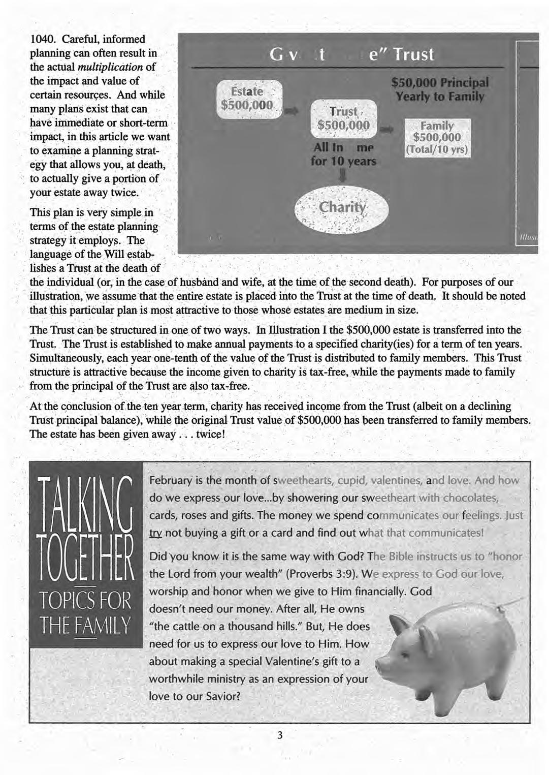The> .' > . . . . ;'. ,lishes'a Tfust:at the oeath6f; ." ,.' ' .• the individual (or; in of 'and thne second death). For purposes of our ' .: ; triist at the time of'death. It be npted , "that partic:tii;rr attractlv.e medium in size. . 'in tilusliation Ithe$500,OOO is transferred into the Trust, .The Trust isesrabtish¢to.malceannual paym¢nts .'to a.speCified·charity(ies) fOJ; aterm of ten years. SimulUu1eously, to familY members. This Trust. · sttuCfut¢ is attractive becaQ'se. the iricOliieg1ven to charity' is ;'While the payments· made to family from tQe'pnnCipal6ftheTruSt are " , .' " . . ffom ttte (albeit on a " Trust:principat'balarice trust bas been transferred to family members. the estate has been .:: .... '