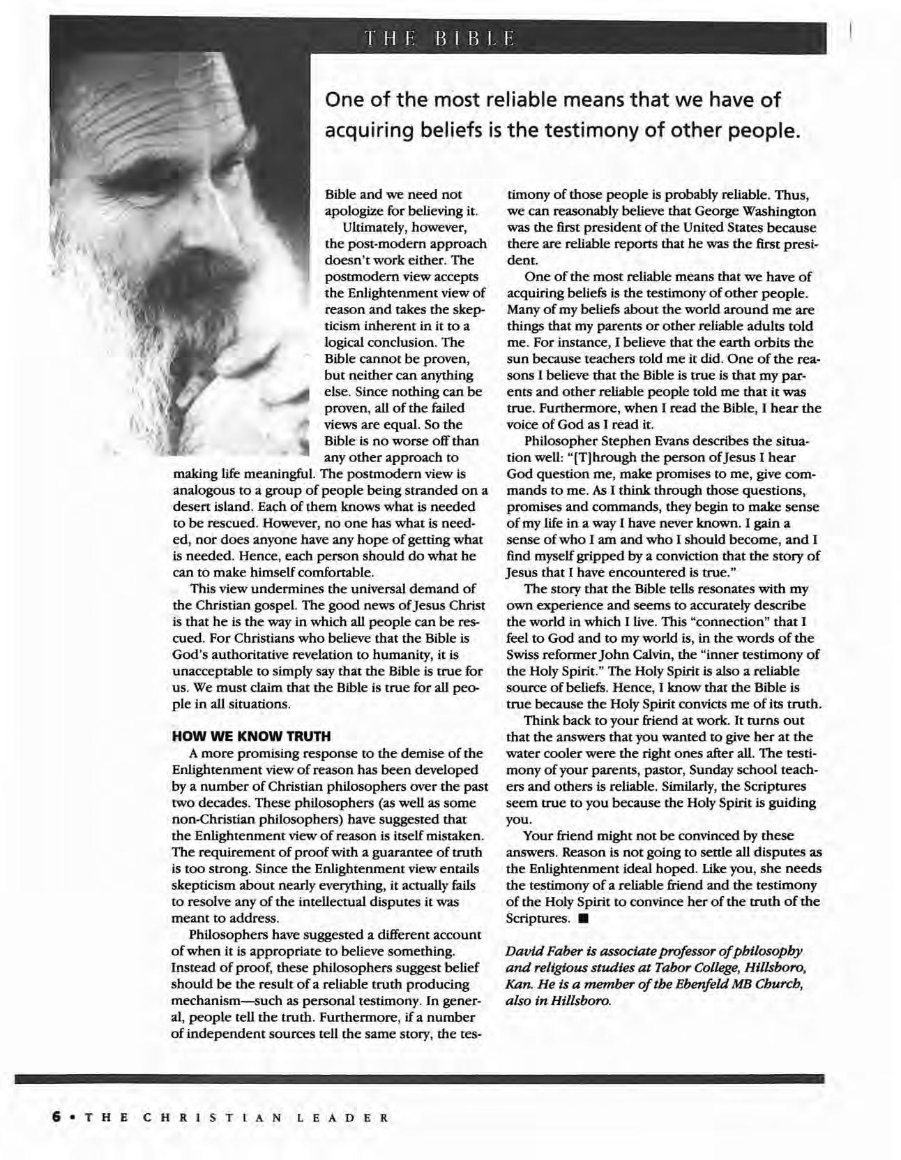 David Faber is associate professor ofphilosophy and religious studies at Tabor College, Hillsboro, Kan. He is a member of the Ebenfeld MB Church, also in Hillsboro.