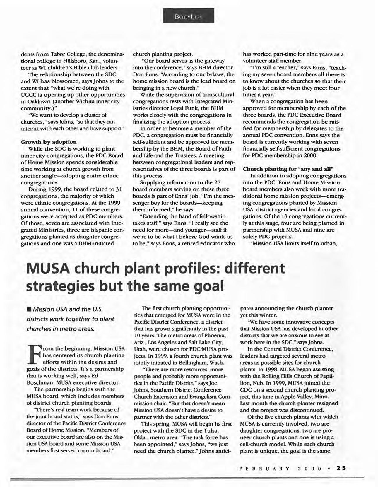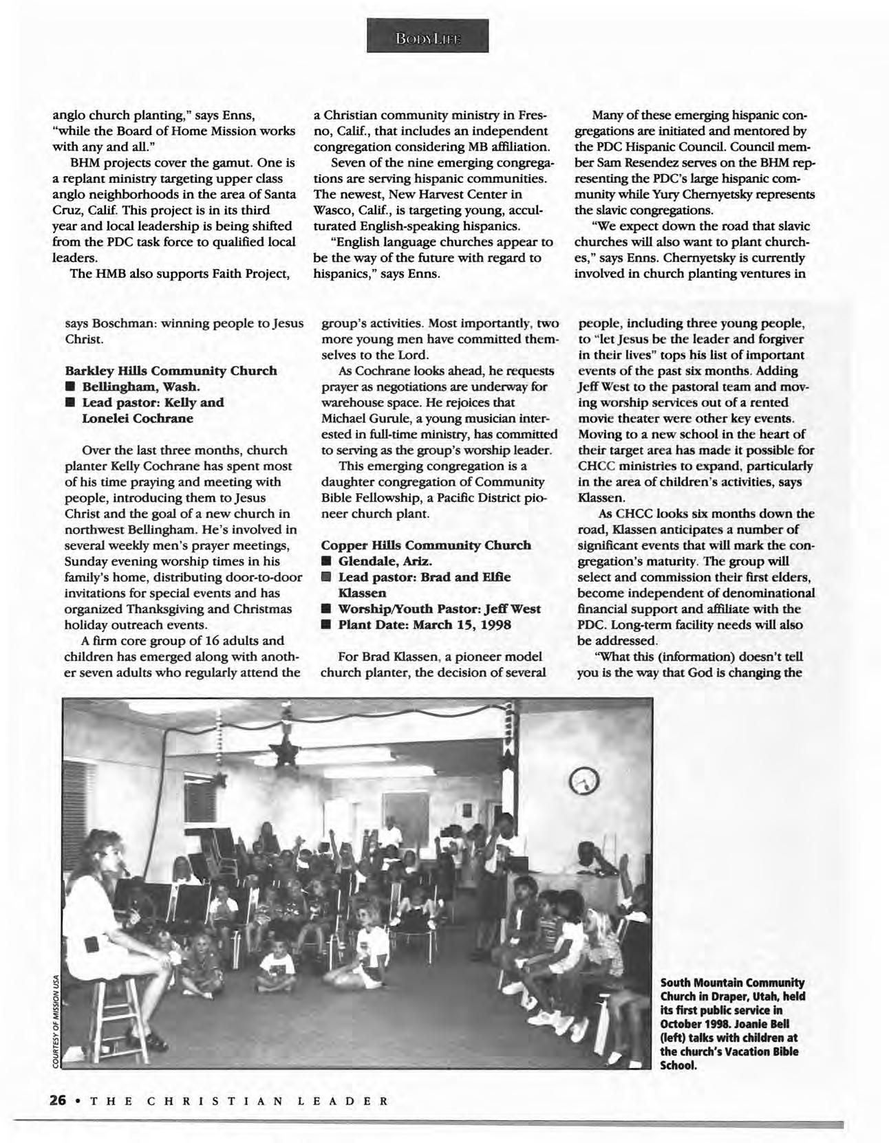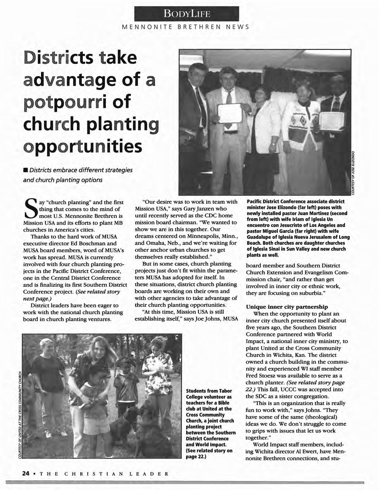 Though we may be experiencing a leadership crisis, our current leaders are leading us forward. In BodyLife, we introduce a new series of church profiles. Over the next few months, we will be taking "a closer look at who we are" by examining how these individual churches challenge the rest of us to be better servants of Christ. In this issue, we also take a look at the church planting efforts of our districts and national conference.