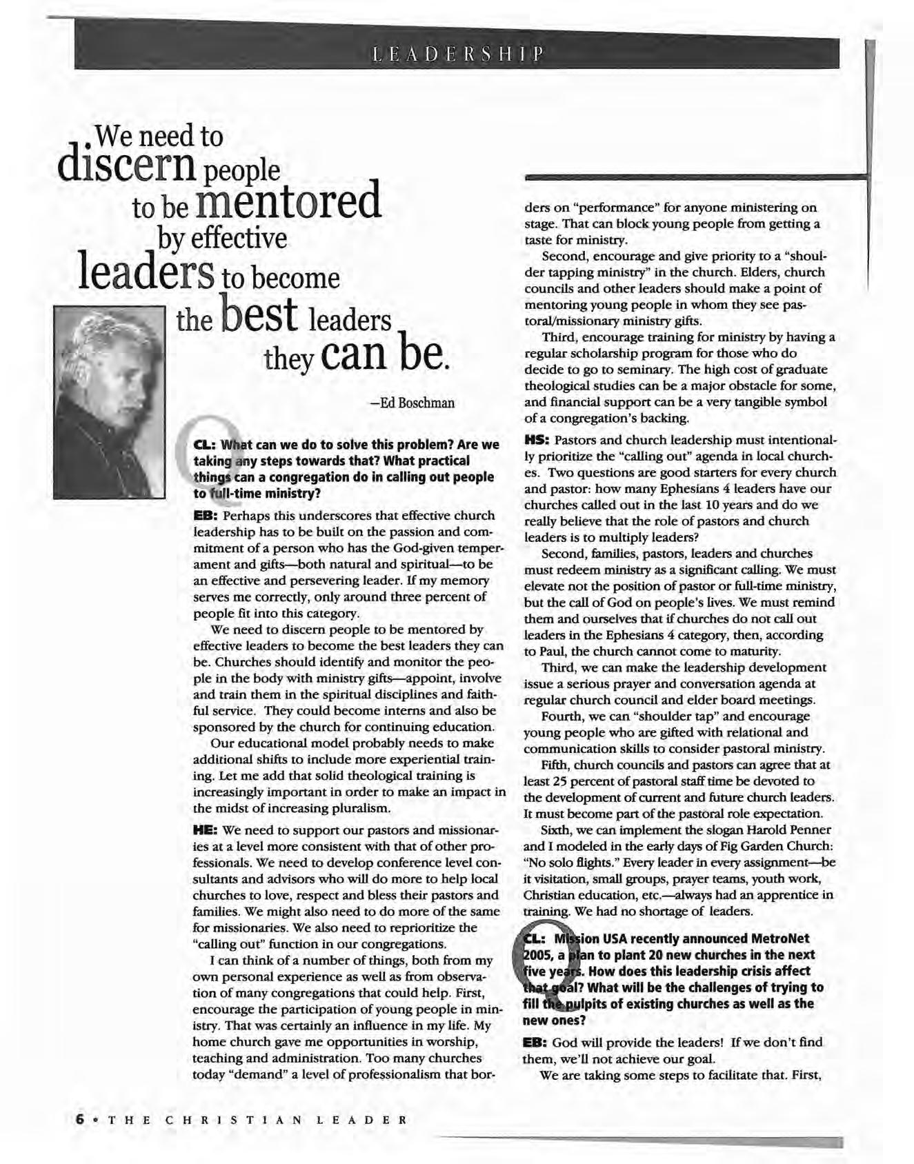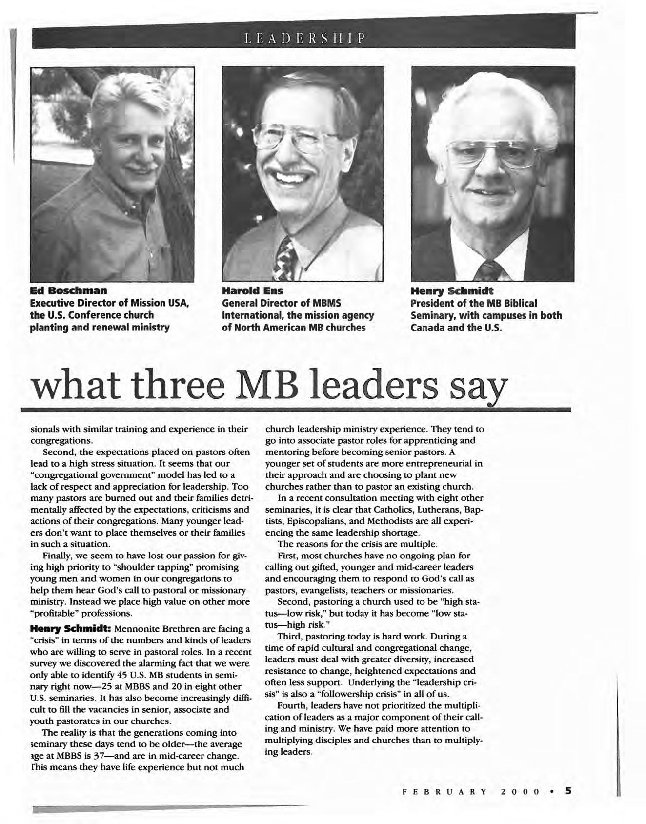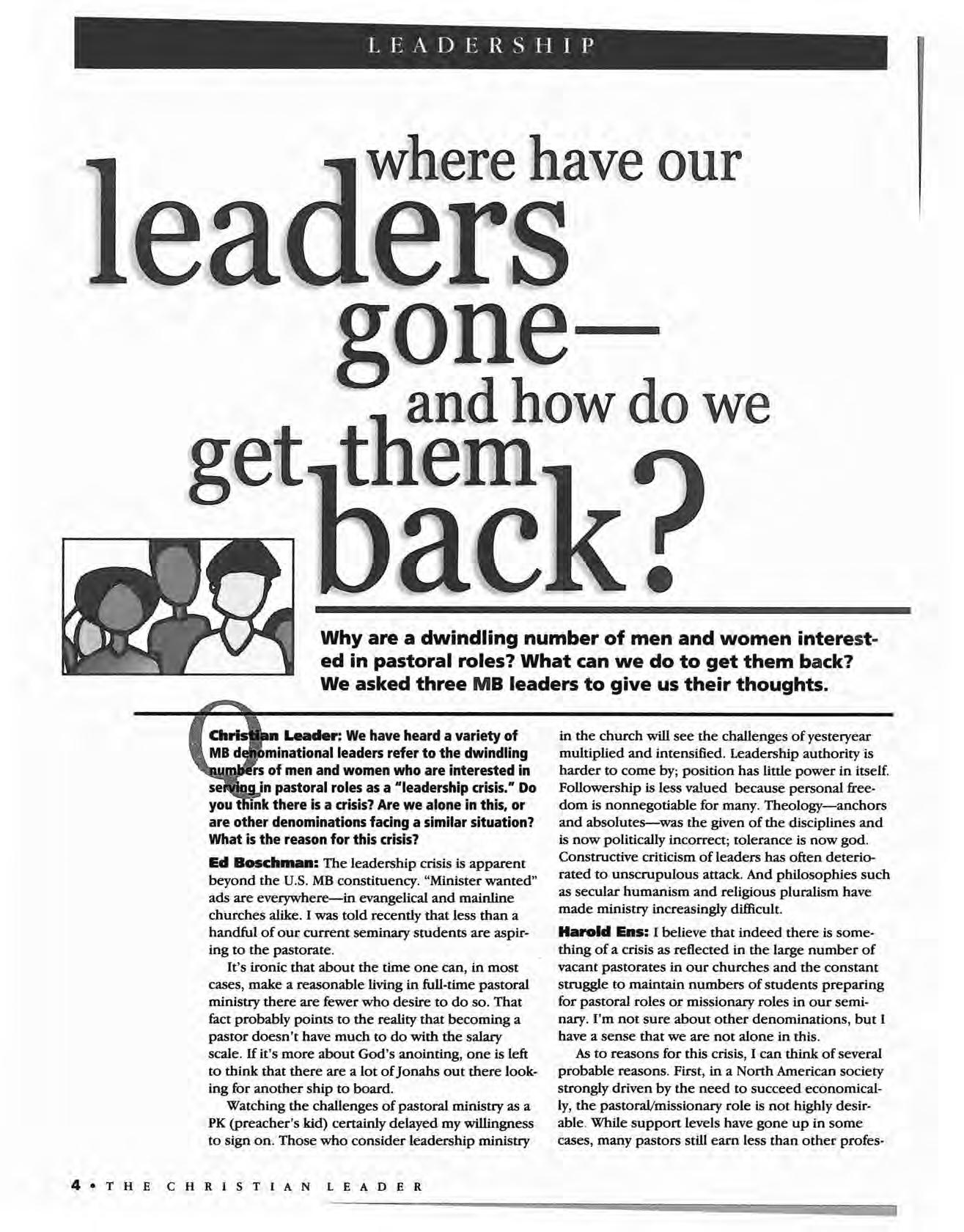 Ed Boschman: The leadership crisis is apparent beyond the U.S. MB constituency. "Minister wanted" ads are everywhere-in evangelical and mainline churches alike. I was told recendy that less than a handful of our current seminary students are aspiring to the pastorate.