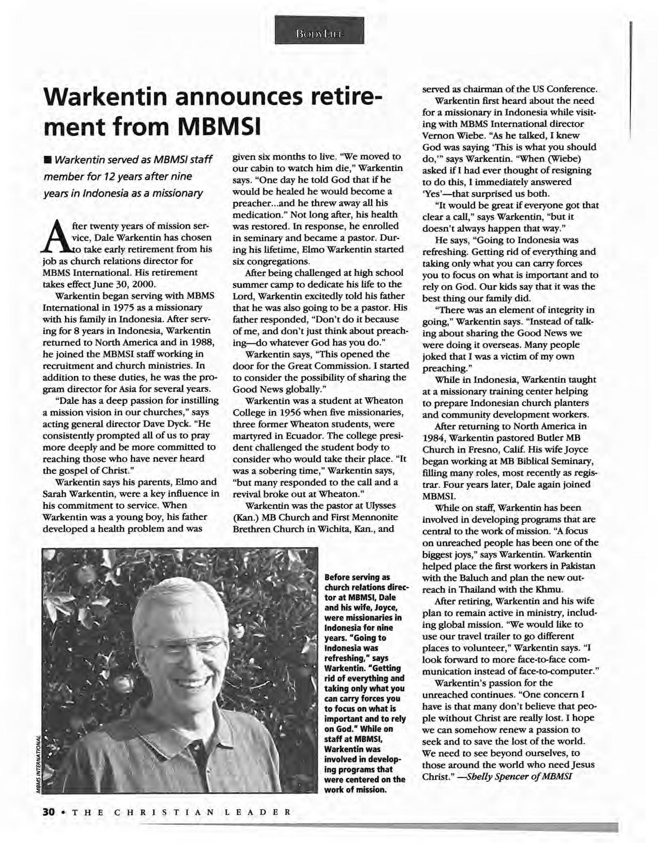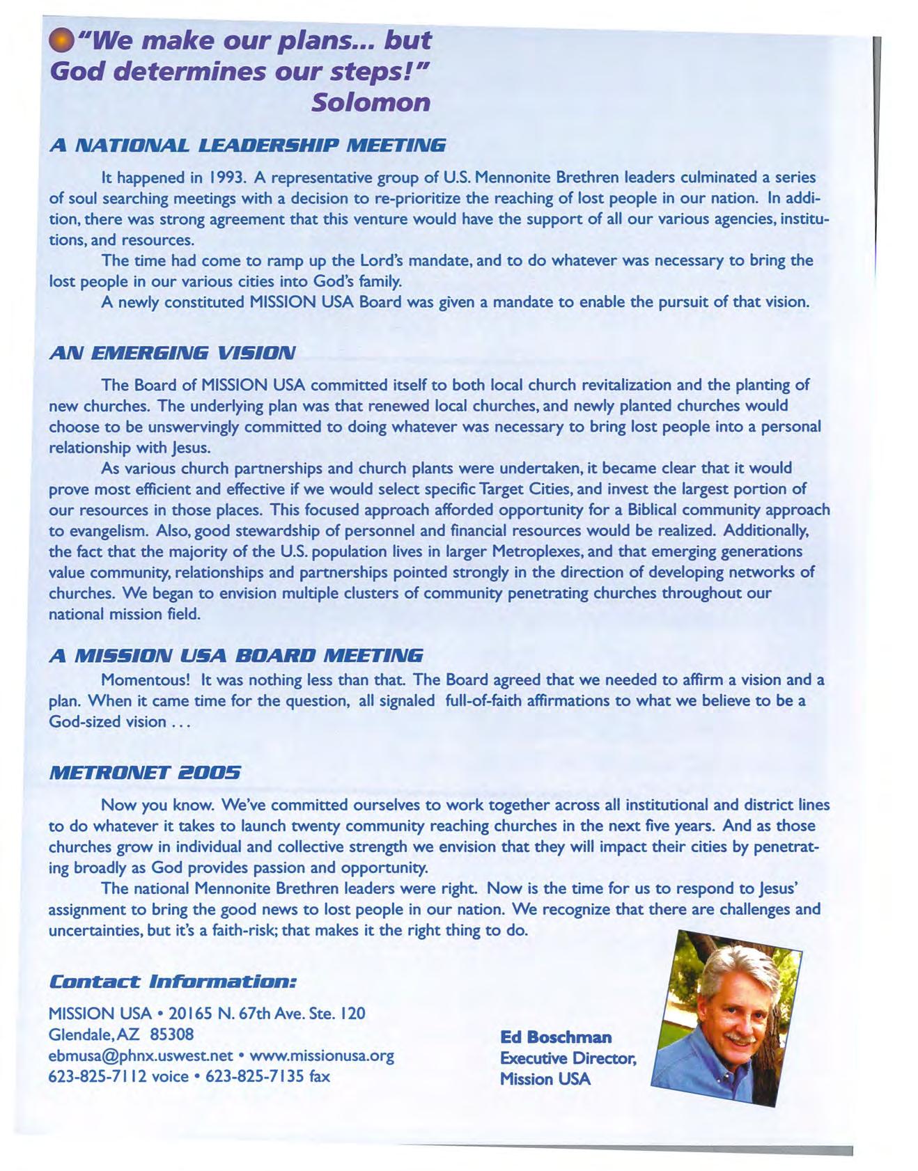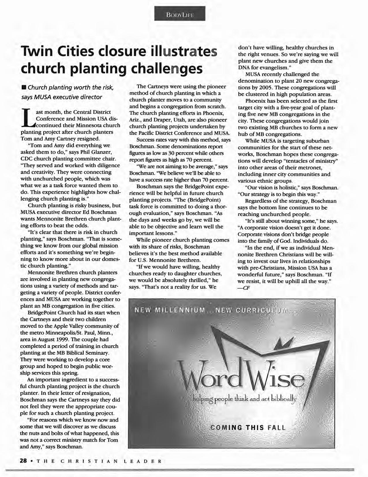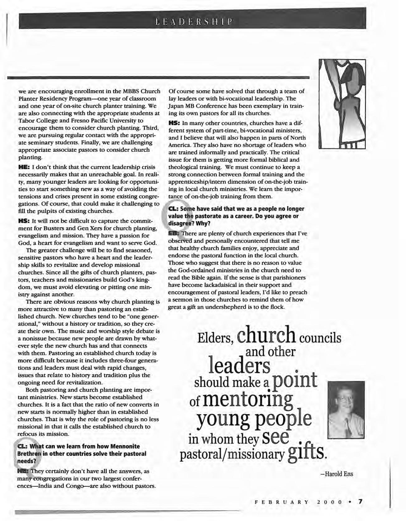 Ed Boschman: The leadership crisis is apparent beyond the U.S. MB constituency. "Minister wanted" ads are everywhere-in evangelical and mainline churches alike. I was told recendy that less than a handful of our current seminary students are aspiring to the pastorate.