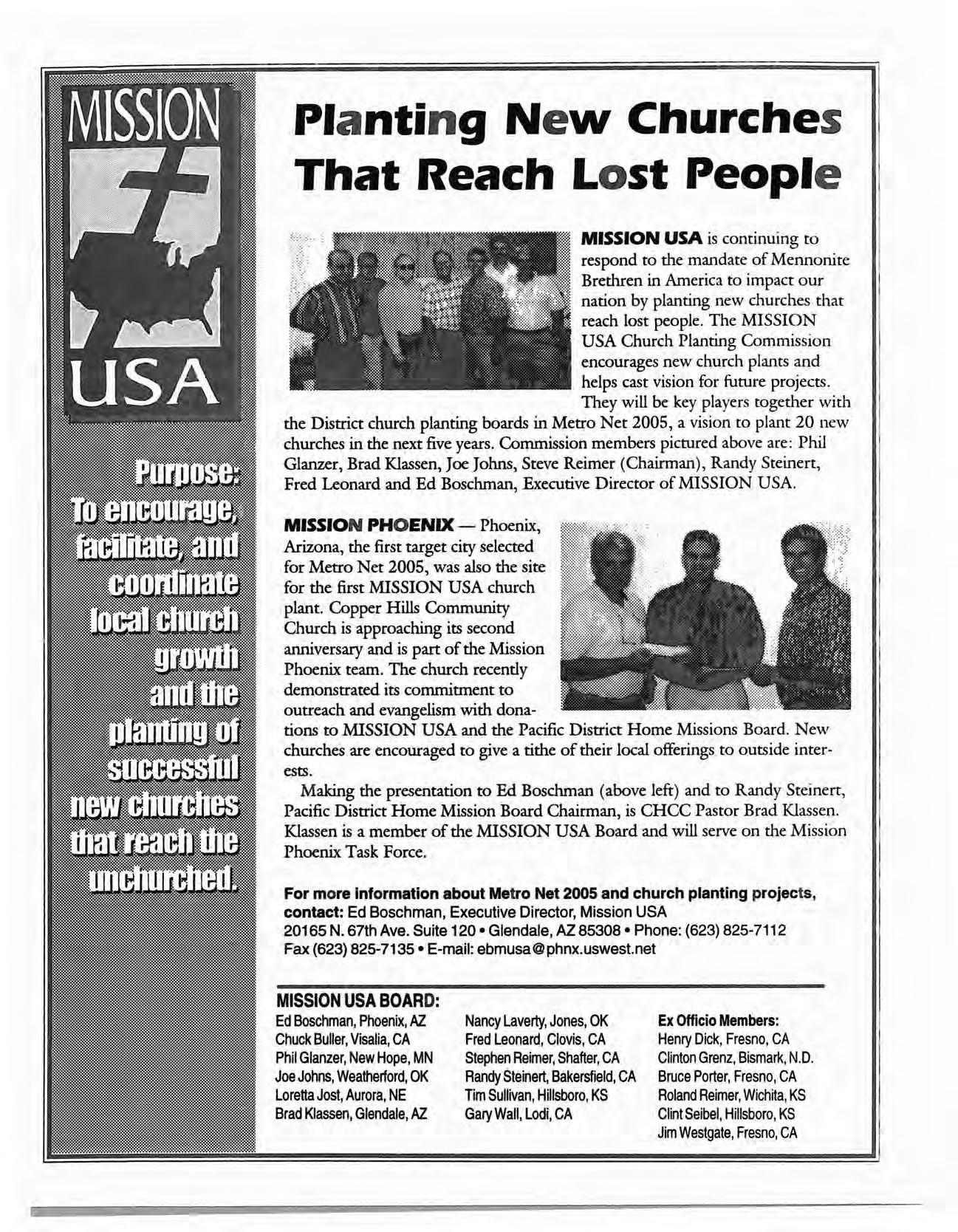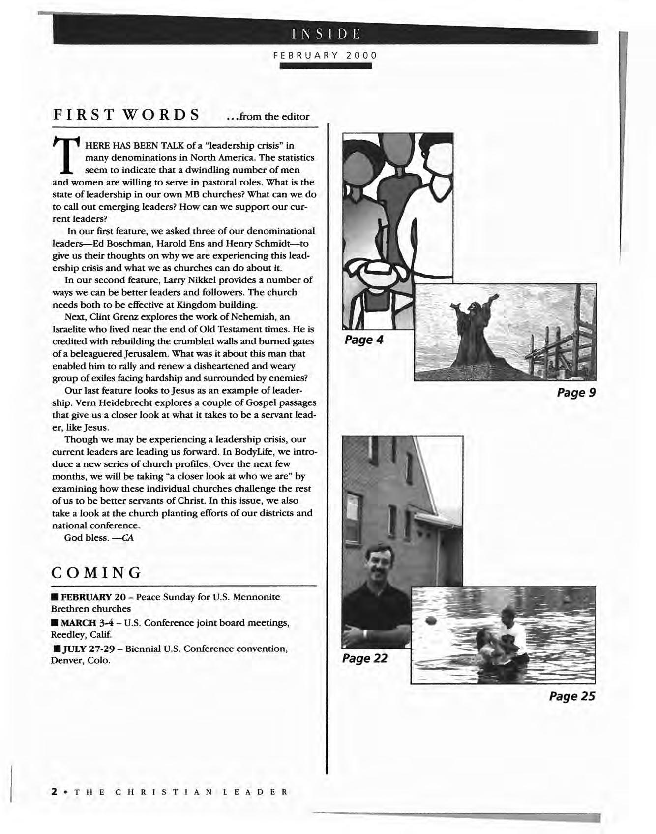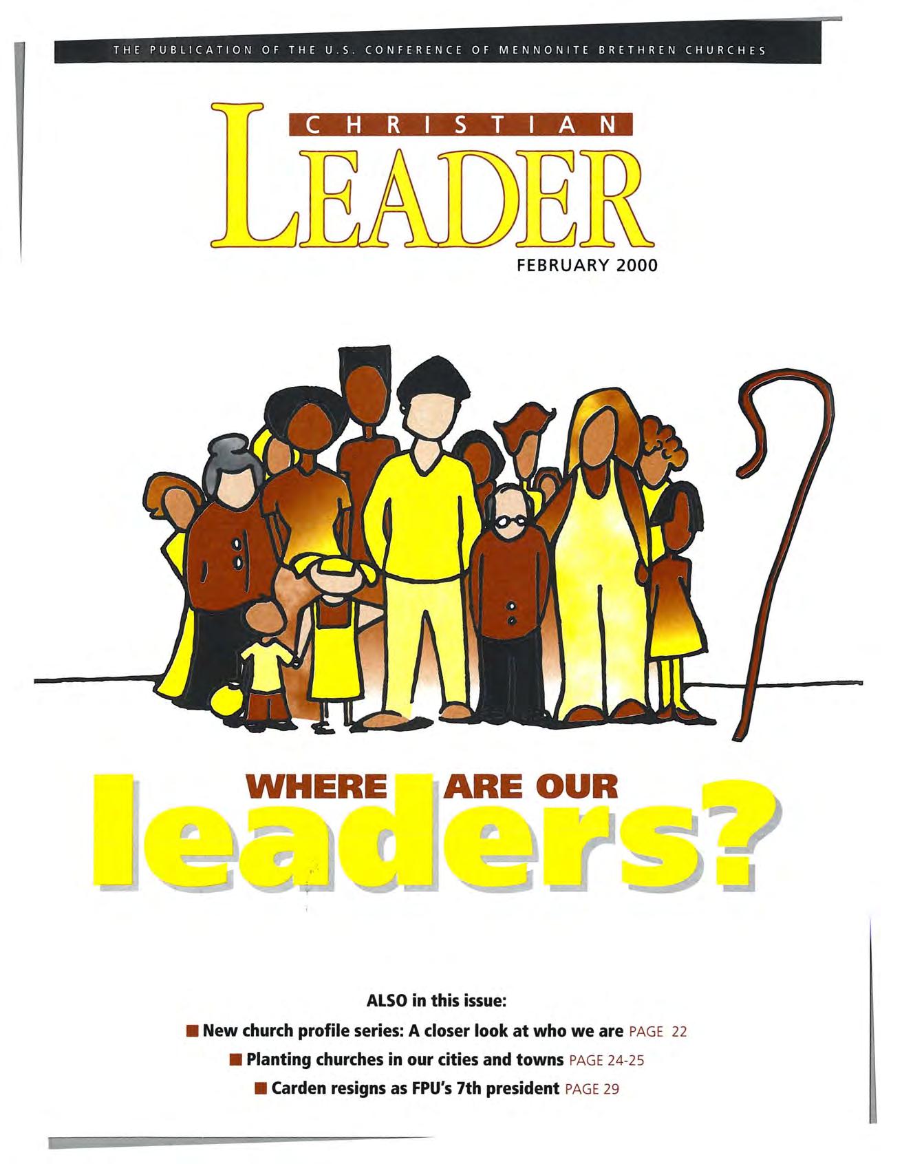 The Christian Leader (ISSN 0009-5149) is published monthly by the U.S. Conference of Mennonite Brethren Churches, 315 S. lincoln, Hillsboro, KS 67063. The Christian Leader seeks to inform Mennonite Brethren members and churches of the events, activities, decisions and issues of their denomination, and to instruct. inspire and initiate dialog so members will aspire to be faithful disciples of Christ as understood in the evangelical/Anabaptist theological tradition. However, the views expressed in this publication do not necessarily represent the position of the Christian Leader, the Board of Communications or the Mennonite Brethren Church.